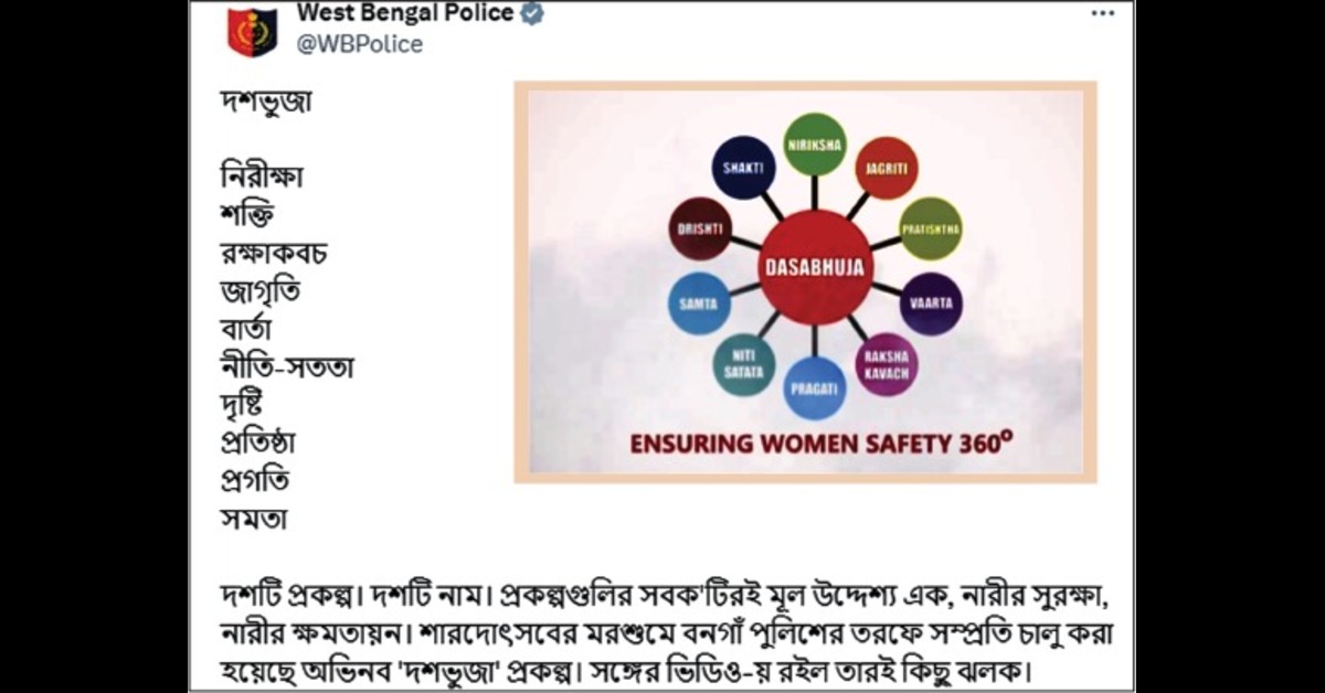 প্রতিবেদন : লক্ষ্য নারীর সুরক্ষা, নারীর ক্ষমতায়ন। শারদোৎসবের মরশুমে রাজ্য পুলিশের অভিনব উদ্যোগ ‘দশভুজা’ প্রকল্প। মা দশভুজা যেমন তাঁর ১০ হাতে ১০ অস্ত্র নিয়ে অসুর দমন করেছিলেন, তেমনি রাজ্য পুলিশ ১০ প্রকল্প চালু করে মহিলাদের সুরক্ষায় তৎপর হল।