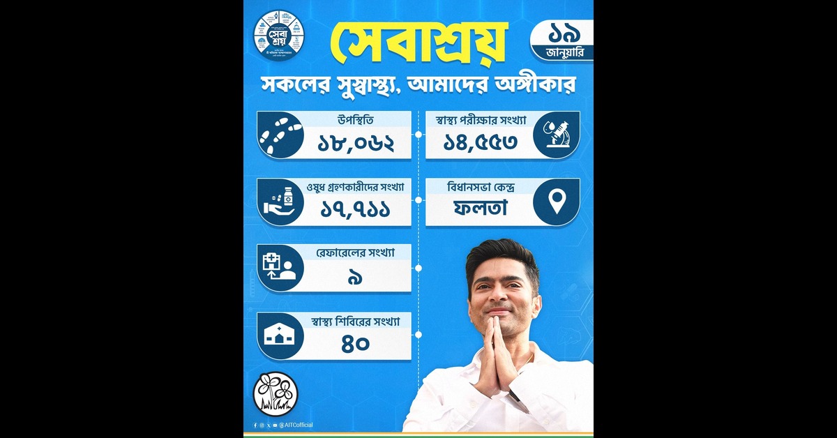 সেইসঙ্গে বিভিন্ন রকমের টেস্ট ও ওষুধ বিতরণও করা হয়। উন্নত চিকিৎসার জন্য অনেককে রেফার করা হয় রাজ্যের হাসপাতালে। ডায়মন্ড হারবার ও ফলতা মিলিয়ে মোট ১৮ দিন পরিষেবা প্রদান করা হল। সেবাশ্রয়ের সূচনা থেকে এদিন পর্যন্ত ৩,৯০,৮২৯ জন পরিষেবা পেলেন। ডায়মন্ড হারবার লোকসভার অন্তর্গত আরও পাঁচটি বিধানসভা এলাকায় হবে এই শিবির। এদিন এক্স হ্যান্ডেলে অভিষেক বন্দ্যোপাধ্যায় লেখেন, সেবাশ্রয়ে সম্মিলিত পদক্ষেপে জনগণকে স্বাস্থ্যসেবা প্রদান করছি আমরা। বিনামূল্যে চিকিৎসা সেবা নিচ্ছেন মানুষ।