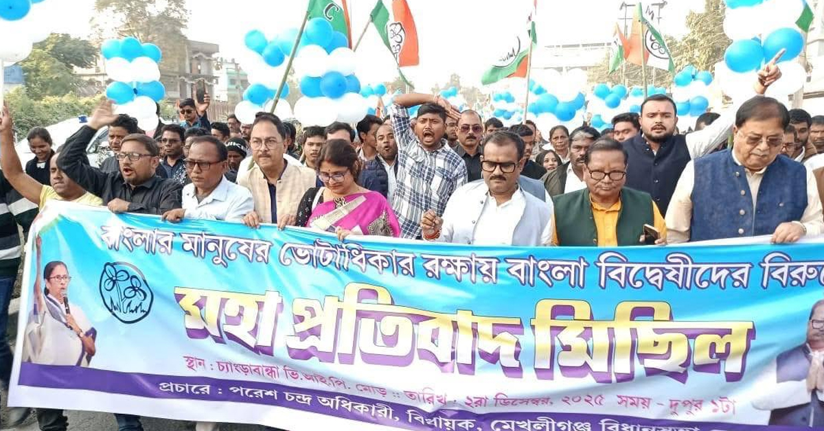 সংবাদদাতা, কোচবিহার : বাংলার মানুষের ভোটাধিকার রক্ষায় বাংলাবিদ্বেষীদের বিরুদ্ধে মহাপ্রতিবাদ মিছিল হল কোচবিহারের (Cooch Behar) মেখলিগঞ্জে। চ্যাংড়াবান্ধা ভিআইপি মোড়ে জমায়েত হন তৃণমূল কর্মীরা। এরপর মিছিলে পা মেলান উত্তরবঙ্গ উন্নয়নমন্ত্রী উদয়ন গুহ, প্রতিমন্ত্রী দিলীপ মণ্ডল, তৃণমূল জেলা সভাপতি অভিজিৎ দে ভৌমিক, মেখলিগঞ্জের তৃণমূল বিধায়ক পরেশচন্দ্র অধিকারী, মহিলা তৃণমূল জেলা সভানেত্রী শুচিস্মিতা দেবশর্মা, শ্রমিক সংগঠনের জেলা সভাপতি রাজেন্দ্রকুমার বৈদ্য, ছাত্রনেতা সায়নদীপ গোস্বামী প্রমুখ। সম্প্রতি পুলিশের অনুমতি ছাড়াই আন্তর্জাতিক স্থলবন্দরের রাস্তায় রাজনৈতিক সভা করে সঙ্কল্পযাত্রা করেছিল বিজেপি। তাতে আইনি পদক্ষেপ নিয়েছে পুলিশ। তারই পাল্টা জবাব দিল মঙ্গলবার তৃণমূল। নীল-সাদা বেলুন ও দলের পতাকা ছয়লাপ ছিল তৃণমূলের মিছিল। উদয়ন বলেন, মেখলিগঞ্জে বেড়াতে এসেছিলেন বিজেপি নেতারা। তাঁদের সেই বেড়ানোর পাল্টা আজ কত লোক দলে দলে তৃণমূলের পক্ষ থেকে পথে নেমেছে তা দেখুক বিজেপি। বিজেপি যেখানে মিছিল করবে তার ৪৮ ঘণ্টার মধ্যে আমরা পাল্টা মিছিল করে দেখিয়ে দেব বিজেপির পায়ের তলায় মাটি নেই। অভিজিৎ বলেন, যেভাবে কাজ করেছেন তাতে ৯৮ শতাংশ কাজ হয়ে গিয়েছে। প্রতিটি ভোটারের অস্তিত্ব আছে। তাঁরা কেউ রোহিঙ্গা নন, তাঁরা বাংলাদেশ থেকেও আসেনি। বাজনার তালে তালে পতাকা নাচতে দেখা যায় উচ্ছ্বসিত কর্মীদের। তৃণমূলের দাবি, সভায় রেকর্ড ভিড় হয়েছে।