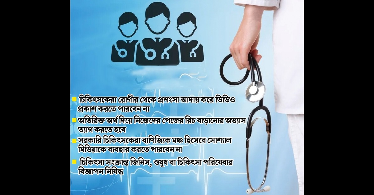 সরাসরি চিকিৎসকদের বাণিজ্যিক মঞ্চ হিসাবে সোশ্যাল মিডিয়ার ব্যবহারের উপরও রাশ টেনেছে কমিশন। নির্দেশিকায় বলা হয়েছে চিকিৎসক হিসাবে রেজিস্ট্রেশন যাঁদের রয়েছে তাঁরা সরাসরি কোনও চিকিৎসা-সংক্রান্ত জিনিস, ওষুধ বা চিকিৎসা পরিষেবার বিজ্ঞাপন করতে পারবেন না। সেই সঙ্গে কোনও বিশেষ চিকিৎসা যেমন, সিটি স্ক্যান বা পেট সিটি স্ক্যানের মতো চিকিৎসার প্রচার করতে পারবেন না। সেই সঙ্গে রোগীদের সরাসরি বা ঘুরপথে কোনওভাবে পরামর্শ দেওয়ার কাজও সোশ্যাল মিডিয়া প্ল্যাটফর্ম ব্যবহার করে করার উপর নিষেধাজ্ঞা জারি করা হয়েছে। সোশ্যাল মিডিয়ার ব্যবহারে এমন কোনও কাজ করার উপর নিষেধাজ্ঞা জারি করা হয়েছে যা চিকিৎসকদের নৈতিকতা-বিরোধী। অর্থাৎ ন্যাশানাল মেডিক্যাল কমিশনের নির্দেশিকা অনুযায়ী রাষ্ট্র যেমন চিকিৎসক ও স্বাস্থ্যকর্মীদের নিরাপত্তার দিকটির দায়িত্ব নেবে, তেমনই চিকিৎসকদেরও দায়িত্বশীল ভূমিকা পালনের উপর জোর দেওয়া হয়েছে।