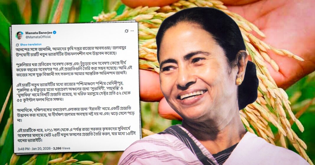 রাজ্যের কৃষি গবেষণায় বড় সাফল্যের কথা জানালেন মুখ্যমন্ত্রী মমতা বন্দ্যোপাধ্যায় (CM Mamata Banerjee)। মঙ্গলবার নিজের এক্স হ্যান্ডলে তিনি জানান, রাজ্যের আবহাওয়া ও জলবায়ুর উপযোগী চারটি নতুন উচ্চফলনশীল ধানের ভ্যারাইটি উদ্ভাবন করেছেন কৃষি দপ্তরের গবেষকরা। দীর্ঘ কয়েক বছরের গবেষণার পর পুরুলিয়ার খরা প্রতিরোধ গবেষণা কেন্দ্র এবং চুঁচুড়ার ধান গবেষণা কেন্দ্রের বিজ্ঞানীদের হাত ধরেই এই নতুন প্রজাতিগুলি তৈরি হয়েছে বলে জানিয়েছেন মুখ্যমন্ত্রী।
