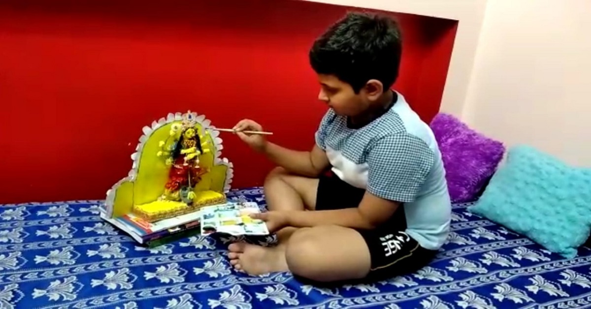বিশ্বজিৎ চক্রবর্তী, আলিপুরদুয়ার: ছোট্ট দু’ হাত মেখেছে রং। চারপাশে ছড়িয়ে তুলি, পেন্সিল, আর শেষ হওয়া রঙের কৌটো। কচি আঙুলের ফাঁকে সরু তুলি। বিছানার এক কোণেই হল মা দুর্গার চক্ষুদান। এভাবেই আপন মনে নিজের দুর্গা তৈরি করছে ডিক দত্ত। পঞ্চম শ্রেণির ছাত্র। ছোট থেকেই তার ছবি আঁকার প্রতি প্রচণ্ড আগ্রহ দেখে তাকে ছবি আঁকার শিক্ষকের কাছে দেওয়া হয়।