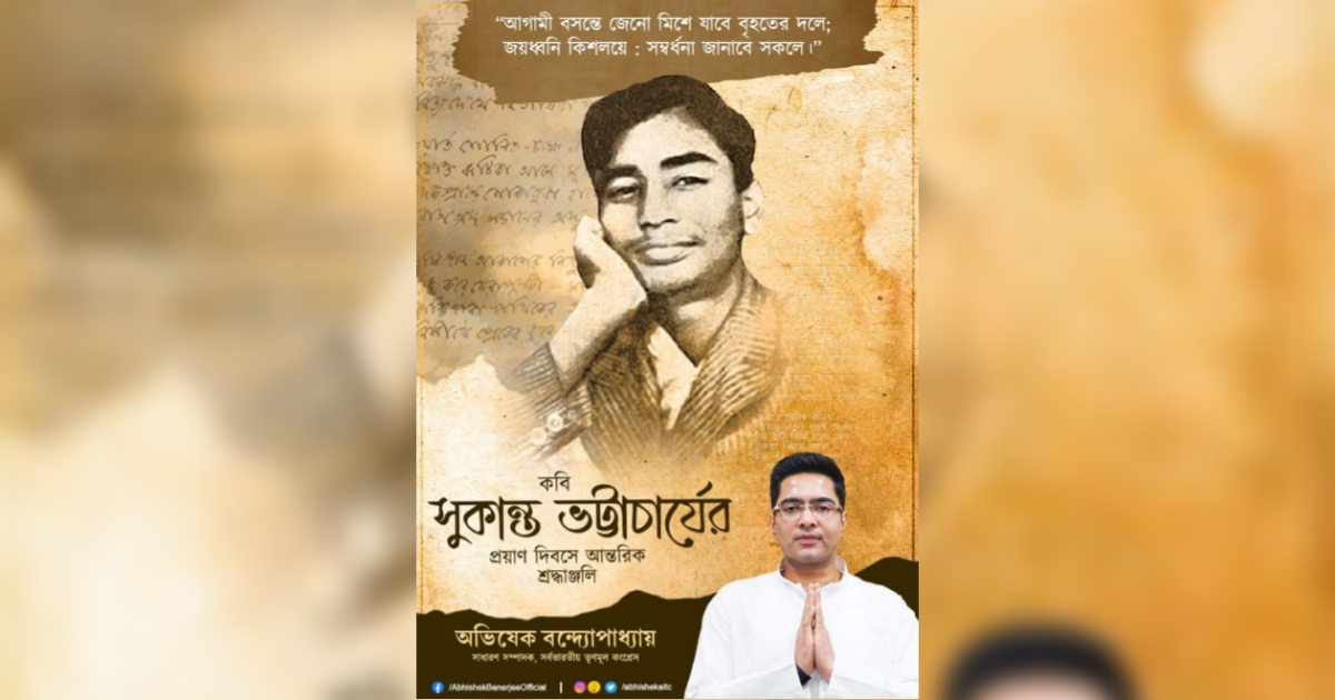 আজ ১৩ মে, কবি সুকান্ত ভট্টাচার্যের (Poet Sukanta Bhattacharya) ৭৫তম মৃত্যুবার্ষিকী। ১৯৪৭ সালের আজকের দিনে তিনি মারা যান। যক্ষা রোগে আক্রান্ত হয়ে হয়ে মাত্র ২১ বছর বয়সে মারা যান সুকান্ত ভট্টাচার্য (Poet Sukanta Bhattacharya)। তাঁর প্রয়াণ দিবসে শ্রদ্ধার্ঘ্য জানালেন ডায়মন্ড হারবারের তৃণমূল কংগ্রেস সাংসদ তথা তৃণমূল কংগ্রেসের সর্বভারতীয় সাধারণ সম্পাদক অভিষেক বন্দ্যোপাধ্যায় (TMC MP Abhishek Banerjee)।