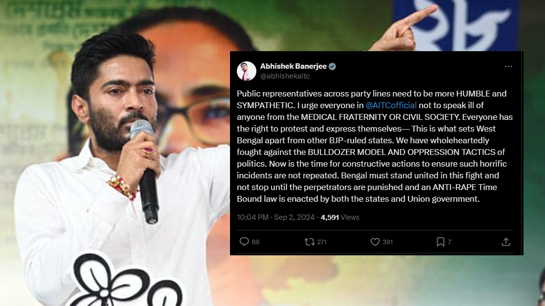 আন্দোলনরত চিকিৎসকদের নিয়ে বিতর্কিত মন্তব্য করেন বেশ কয়েকজন তৃণমূল কংগ্রেস নেতৃত্ব। এরপরেই মাঠে নেমে বেশ কড়া ভাষায় ‘ওয়ার্নিং’ দিলেন তৃণমূল কংগ্রেসের সর্বভারতীয় সাধারণ সম্পাদক অভিষেক বন্দ্যোপাধ্যায় (Abhishek Banerjee) । যদিও নিজের এক্স হ্যান্ডেলে পোস্ট করে তিনি সরাসরি কোন নাম লেখেন নি। আজ সোমবার রাতের দিকে অভিষেক বন্দ্যোপাধ্যায় নিজের এক্স হ্যান্ডেলে লেখেন, ‘’দল নির্বিশেষে জনপ্রতিনিধিদের আরও নম্র এবং সহানুভূতিশীল হতে হবে। তৃণমূল কংগ্রেসের প্রত্যেকের কাছে আমার আর্জি যে তাঁরা যেন স্বাস্থ্য সমাজ বা নাগরিক সমাজের কারও বিরুদ্ধে কোন রকম বিরূপ মন্তব্য না করেন। প্রত্যেকের প্রতিবাদ এবং মতপ্রকাশের অধিকার আছে। প্রত্যেকের প্রতিবাদ এবং মতপ্রকাশের অধিকার আছে আর এই বিষয়টাই বিজেপি-শাসিত রাজ্যের থেকে বাংলাকে স্বতন্ত্র করে তোলে। আমরা নিজেদের সর্বস্ব উজাড় করে ‘বুলডোজার’ মডেল এবং গণতন্ত্রকে দমিয়ে রাখার রাজনৈতিক কৌশলের বিরুদ্ধে লড়াই করেছি।”