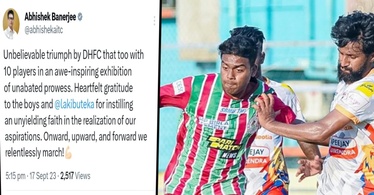 এক্সে অভিষেক বন্দ্যোপাধ্যায় নিজের দল ডায়মন্ড হারবার এফসিকে শুভেচ্ছা জানিয়ে লেখেন, ‘অবিশ্বাস্য বীরত্বের সঙ্গে ১০ জন খেলোয়াড় নিয়ে এক বিস্ময়কর পরিস্থিতিতে DHFC-এর অবিশ্বাস্য জয়। সকল খেলোয়াড়ের প্রতি আমার আন্তরিক কৃতজ্ঞতা। আমাদের আকাঙ্খার বাস্তবায়নে অনড় থাকার জন্য ধন্যবাদ। আমাদের এভাবেই নিরলসভাবে অগ্রসর হওয়াই হল মূল লক্ষ্য।’