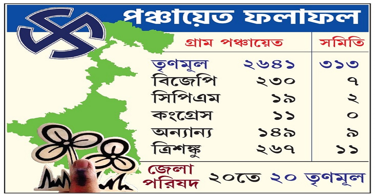 ১৩টি জেলায় একেবারে মুখ থুবড়ে পড়েছে গেরুয়া শিবির। উত্তরের ৪ জেলায় এবং দক্ষিণের ৯ জেলায় খাতাই খুলতে পারেনি বিজেপি। প্রকৃত অর্থেই অত্যন্ত করুণ দশা। মুখ্যমন্ত্রীর নেতৃত্বে রাজ্যের ধারাবাহিক উন্নয়ন নিঃসন্দেহে সুদৃঢ় করেছে গ্রামের অর্থনৈতিক বুনিয়াদকে। বিভিন্ন সামাজিক উন্নয়ন প্রকল্পের দৌলতে বাংলায় নারীর ক্ষমতায়ণ আজ বিশ্বের বিস্ময়। এর সবকিছুরই প্রতিফলন ঘটেছে এবারের জনাদেশে। স্বাভাবিকভাবেই উচ্ছ্বসিত তৃণমূলের নেতা-কর্মী-সমর্থকরা মনে করছেন মানুষের প্রতি তাঁদের দায়িত্ব আরও বেড়ে গেল।