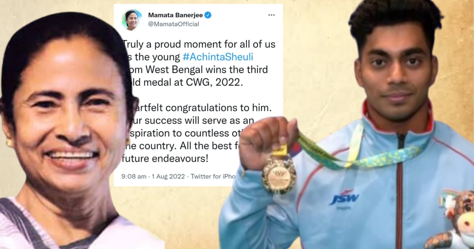 টুইটারে মুখ্যমন্ত্রী লিখেছেন, “আমাদের সকলের জন্য সত্যিই একটি গর্বের মুহূর্ত কারণ পশ্চিমবঙ্গের ছেলে অচিন্ত্য শিউলি কমনওয়েলথ গেমস ২০২২-এ তৃতীয় স্বর্ণপদক জিতেছে৷ তাঁকে জানাই আন্তরিক অভিনন্দন। আপনার সাফল্য দেশের অগণিত মানুষের জন্য অনুপ্রেরণা হিসাবে কাজ করবে।”