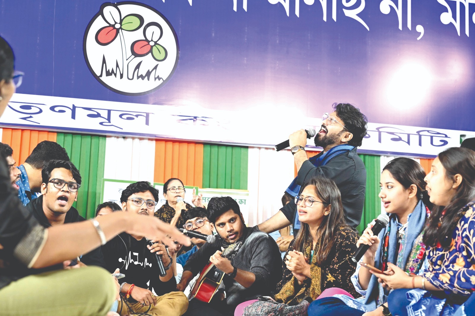 শুক্রবারের ধরনার শেষ পর্যায় জমে ওঠে গানের সুরে। ধরনা মঞ্চে উঠল সুরের ঝংকার। নেত্রীর সামনেই গিটার বাজিয়ে গান পরিবেশন করল তৃণমূল যুবদের ‘জয়ী’ ব্যান্ড। গান ধরলেন রাজ্যের মন্ত্রী বাবুল সুপ্রিয়, ইন্দ্রনীল সেন, অরূপ বিশ্বাস প্রমুখ। গলা মেলালেন স্বয়ং মুখ্যমন্ত্রী মমতা বন্দ্যোপাধ্যায়ও। শেষ মুহূর্তে মঞ্চে ছিলেন তৃণমূল ছাত্রনেতা তৃণাঙ্কুর ভট্টাচার্য, রাজন্যা হালদার, দেবাংশু ভট্টাচার্য-সহ অন্যরা। গানের মধ্যে দিয়েই ধ্বনিত হয় কেন্দ্রের বিরুদ্ধে তীব্র প্রতিবাদের সুর, লড়াইয়ের শপথ।