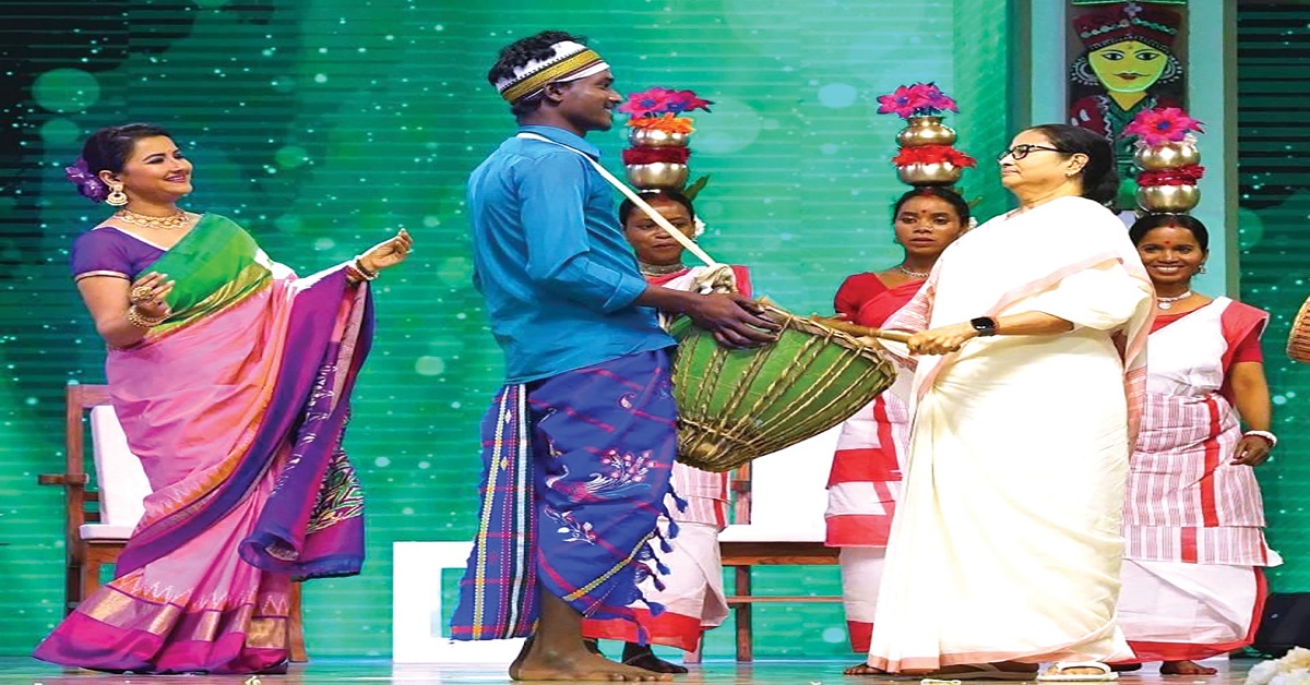 রাজ্য সঙ্গীত দিয়ে রাত ৮টা থেকে শুরু হওয়া দু’ঘণ্টার অনুষ্ঠানে ছিল একের পর এক চমক ও রঙিন সব মুহূর্ত। কখনও আজকের প্রজন্মের সঙ্গীত শিল্পী ও বিধায়ক অদিতি মুন্সি গাইছেন, তোমরা কুঞ্জ সাজাও গো। মুগ্ধ হয়ে শুনছেন মুখ্যমন্ত্রী। আবার একেবারে অঙ্কিতা ভট্টাচার্য আবার রথিজিৎ সেনগুপ্তর গানে মাতল অনুষ্ঠান। ইন্দ্রনীল সেন তাঁর পুরনো অ্যালবাম সুরের বলাকা থেকে গান ধরে মুখ্যমন্ত্রীর কাছে প্রশ্ন করার আগেই অখিলবন্ধু ঘোষের নাম শুনে হেসে ফেললেন। আবার কখনও গান ধরলেন রূপঙ্কর বাগচি। গাইলেন শ্রীরাধা বন্দ্যোপাধ্যায়ও। শালবনী থেকে আসা সাঁওতাল নৃত্যশিল্পীরা মাতিয়ে দিলেন অনুষ্ঠান।