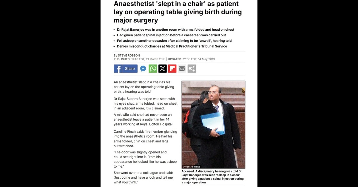 এহেন ডাক্তারবাবু রজতশুভ্র বন্দ্যোপাধ্যায়ের সঙ্গে পরিচয়টা এবার সেরে নেওয়া যাক। রোগী যখন অস্ত্রোপচারের টেবিলে শুয়ে সন্তান প্রসব করছিলেন, তখন এই অ্যানেস্থেশিস্ট চেয়ারে বসে ঘুমিয়ে পড়েছিলেন। শুধু তাই নয়, এতটাই দায়িত্বজ্ঞানহীন যে, রোগী ‘অসুস্থ’ বলে জানিয়ে আরেকবার ঘুমিয়ে পড়েন তিনি। ডেইলি মেল সংবাদপত্রে ফলাও করে তাঁর গুণের কথা ছাপানো হয়েছিল। মেডিক্যাল প্র্যাকটিশনার্স ট্রাইব্যুনাল সার্ভিসে তাঁর অসদাচরণের অভিযোগে মামলা চলে।২০১৩ সালে রয়্যাল বোল্টন হাসপাতালে এই ঘটনা ঘটে। হাসপাতাল কর্মীরাই তাঁর গুণের কথা ফলাও করে জানিয়েছিলেন।