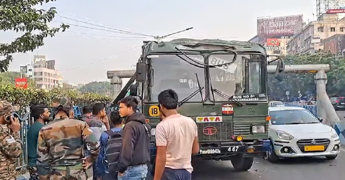 শনিবার সকালে VIP রোডে বাগুইআটি (Baguiati) উড়ালপুলে ওঠার সময় হঠাৎ দুর্ঘটনার কবলে সেনাবাহিনীর বাস। উল্টোডাঙ্গা যাওয়ার পথে বিগ বাজার-দমদম পার্ক উড়ালপুলে ওঠার সময়ে হাইটবারে ধাক্কা লাগে বাসটির। ধাক্কা লাগার পরেই হাইটবারটি ভেঙে সামনে থাকা একটি গাড়ির বনেটের উপরে পড়ে। শুধু তাই নয়, হাইটবারের নীচে আটকে যায় বাসটি। ওই গাড়ির চালক অল্পের জন্য প্রাণে বেঁচে যান। খবর পেয়ে ঘটনাস্থলে পৌঁছয় বাগুইআটি ট্র্যাফিক গার্ড এবং বাগুইআটি থানার পুলিশ। কোনরকমে হাইটবারের নীচে আটকে থাকা সেনার বাসটিকে সরানো হয়। দুর্ঘটনাগ্রস্ত গাড়িটিকে উদ্ধার করা হয়েছে। গাড়িটির সামনের অংশ একেবারেই দুমড়েমুচড়ে গিয়েছে।