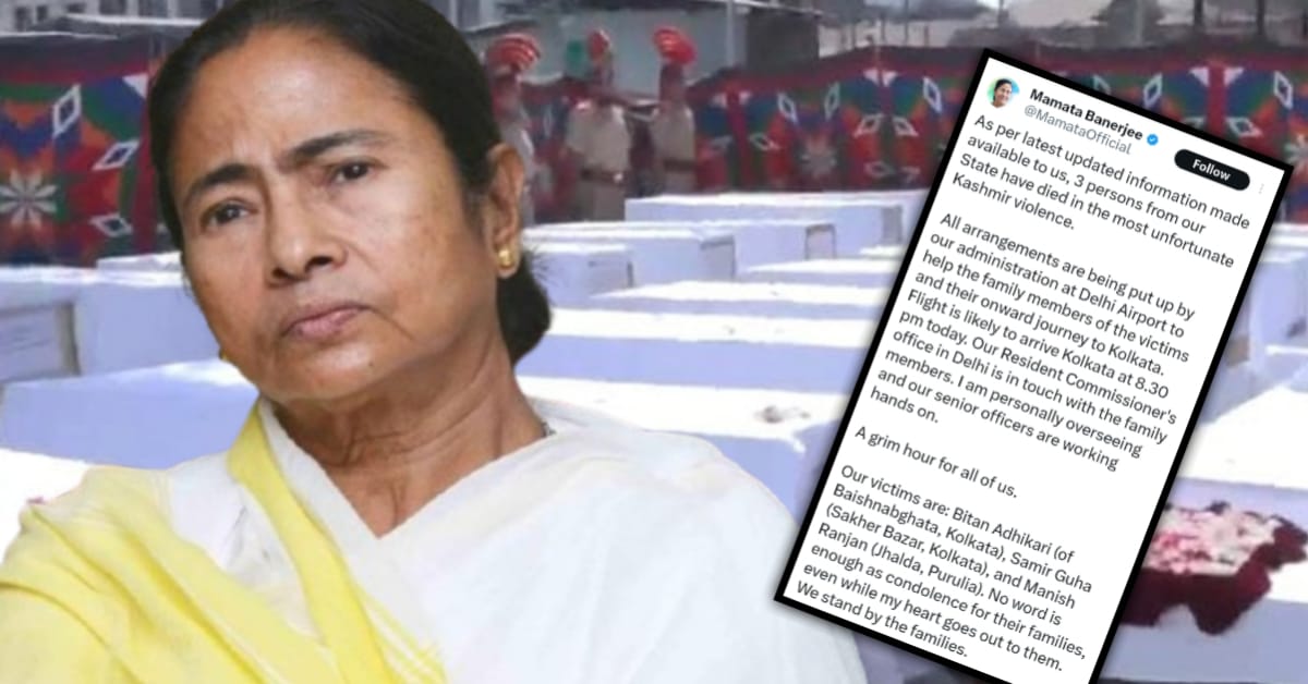 এরপরেই মুখ্যমন্ত্রী নিহতদের নাম ঘোষণা করে লেখেন, ”আমাদের রাজ্যের নিহতরা হলেন: বিতান অধিকারী (বৈষ্ণবঘাটা, কলকাতা), সমীর গুহ (সখের বাজার, কলকাতা), এবং মনীষ রঞ্জন (ঝালদা, পুরুলিয়া)। তাদের পরিবারের প্রতি সমবেদনা জানানোর জন্য কোনও শব্দই যথেষ্ট নয়, তাদের প্রতি আমার সমবেদনা থাকছে। আমরা তাদের পরিবারের পাশে আছি।”