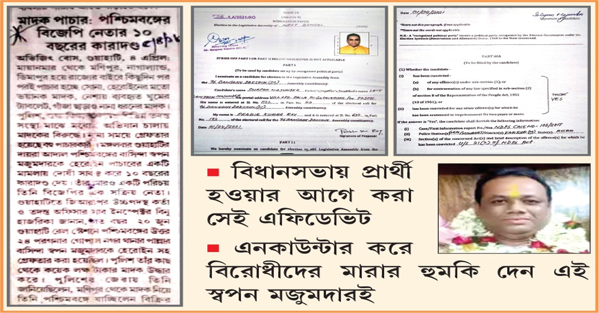 প্রশ্ন হল, কে এই স্বপন মজুমদার (Swapan majumdar)? সোমবার তৃণমূল রাজ্য সাধারণ সম্পাদক কুণাল ঘোষ এবং তৃণমূল কাউন্সিলর ও মুখপাত্র অরূপ চক্রবর্তী নিজেদের এক্স-হ্যান্ডেলে বিজেপির এই কীর্তি প্রকাশ্যে আনেন। তথ্য বলছে, ২০১৭ সালের জুন মাসে স্বপন মজুমদার ড্রাগ-সহ গ্রেফতার হয় অসমের গুয়াহাটিতে। গ্রেফতার করে গুয়াহাটি-কামরূপ জিআরপি। মামলা নম্বর ১০৯/২০১৭। এফআইআর হয় ২১(সি) ধারায়। স্বপন গ্রেফতার হয় মাদক পাচারের অভিযোগে। ২০১৭ সালের ২০ জুন হেরোইন-সহ গ্রেফতার হয় স্বপন। পুলিশ তার কাছ থেকে কয়েক লক্ষ টাকার মাদক পেয়েছিল। পুলিশের জেরায় স্বপন স্বীকার করেছিল ড্রাগ নিয়ে সে পশ্চিমবঙ্গে যাচ্ছিল পাচার করতে। শুনানি শেষে ৫ এপ্রিল ২০১৮ সালে স্বপনের ১০ বছরের জেল হয়। অভিযুক্ত এই বিজেপি নেতার স্থান হয় গুয়াহাটির কেন্দ্রীয় কারাগারে। বিজেপির হাতযশের কারণেই স্বপন পরবর্তী সময়ে জামিন পায় এবং ২০২১ সালের বিধানসভা ভোটে প্রার্থী হয়। এফিডেভিটে স্বীকার করে নেয়, সে ছিল সাজাপ্রাপ্ত আসামি। মাদক পাচারের অভিযোগে ১০ বছরের জেল হয়েছিল। শুধু মাদক পাচারকারী বলেই স্বপন কুখ্যাত নয়, পঞ্চায়েত ভোটের সময় নির্বাচনী প্রচারে বেরিয়ে এই স্বপনই বলেছিল শাসক দলের নেতা-কর্মীদের পুলিশ দিয়ে এনকাউন্টার করাব! কুখ্যাত স্বপন মজুমদার এবার বারাসতের বিজেপি প্রার্থী। ড্রাগ মাফিয়া, হেরোইন পাচারকারী বিজেপির প্রার্থী। হেরোইন পাচারের অভিযোগে ১০ বছরের সাজাপ্রাপ্ত এবং পুলিশি এনকাউন্টারে তৃণমূল নেতা-কর্মীদের খুনের হুমকি দেওয়া মাদক ব্যবসায়ী বিজেপির প্রার্থী।