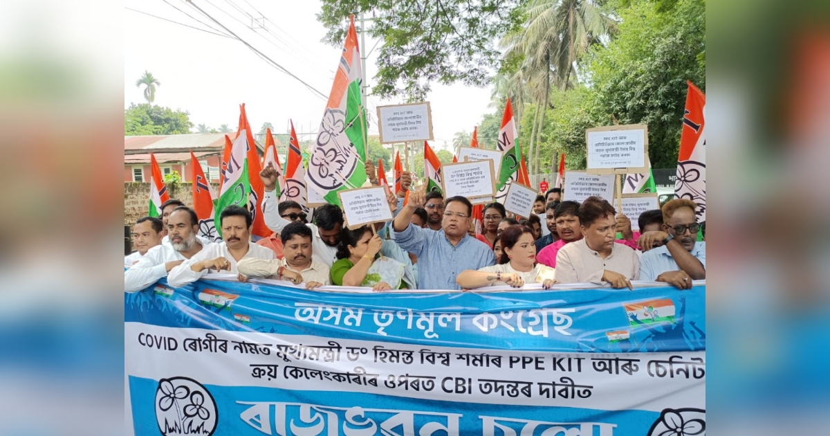 অসম তৃণমূল কংগ্রেসের রাজভবন অভিযান। মুখ্যমন্ত্রী হিমন্ত বিশ্বশর্মার পিপিই কিট কেলেঙ্কারির সিবিআই তদন্তের দাবিতে গুয়াহাটিতে বিক্ষোভ।