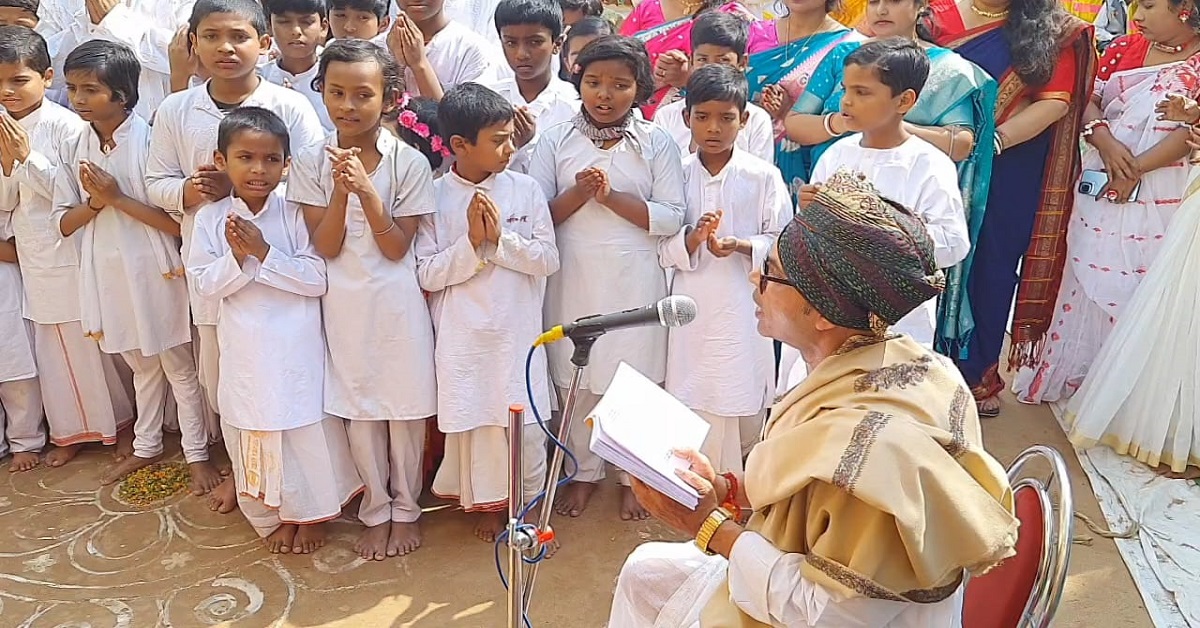 সেই সূত্রেই পুষ্পাঞ্জলিতে শোনা গেল— ‘হে শুভকাল, তোমাকে প্রণাম/ প্রতিদিন সরস্বতী তোমাকে প্রণামে/বেদ-বেদান্ত-বেদাঙ্গ জ্ঞানের আধারে/ এই চন্দন, বেলপাতা পুষ্পাঞ্জলি ভরে/ কালি ও কলম সাথে সরস্বতী তোমাকে প্রণাম।’ ছাত্রছাত্রী থেকে অভিভাবক, শিক্ষাকর্মীরা সমবেতভাবে উচ্চারণ করলেন ‘জয় জয় দেবী চরাচর সারে’-র পরিবর্তে ‘হে দেবী, তুমি কুন্দফুলের চাঁদের আলো/ বরফ-সাদা গলার হারে কি ঝলকালো? বসে আছো পদ্মফুলে/ সুন্দর বাহুমূলে/ রয়েছ বীণা ধরে, অঙ্গে শুভ্র শাড়ি/ ব্রহ্মা, বিষ্ণু, শিব আরও দেবতারই/ প্রিয় দেবী। আমাকে রক্ষা করো/ জড়তা মুক্ত করো,/ ও দেবী সরস্বতী।/ কৃষ্ণের প্রিয়তমা, শুভ্র সরস্বতী/ জিহ্বায় বসত গড়ো।’ বাংলায় অঞ্জলি দিতে পেরে খুশি পড়ুয়ারাও।