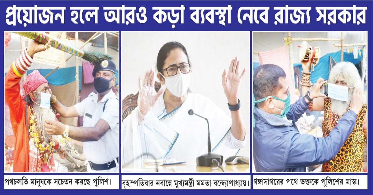 মুখ্যমন্ত্রীর নির্দেশ : মাস্ক পরতেই হবে। হাতে গ্লাভস। নইলে স্যানিটাইজার ব্যবহার করতে হবে। মেয়েরা চুল ঢাকুন। ছেলেরা টুপি পরুন। বাজারে ভিড় করবেন না, দূরত্ব বজায় রাখুন। বাজার থেকে ফিরে জামা-কাপড় বদলে হাত-পা ধুয়ে নিন। বাজার থেকে আনা জিনিস ধুয়ে রাখুন।