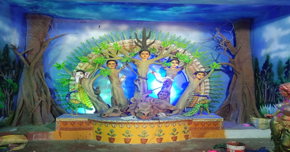 গাছের গুঁড়ি থেকে বেরিয়ে আসছেন দুর্গা ও অন্য প্রতিমা। মণ্ডপের চারিদিকে নানান গাছের ছবি এঁকে বৃক্ষরোপণের বার্তা দেওয়া হয়েছে। ডিআইজি নবীনকুমার পুজোর উদ্বোধন করে বলেন, আবাসিকেরা মুক্তি পেয়ে যাতে মূলস্রোতে ফিরতে পারে সেই চেষ্টা করা হয়। সেই সঙ্গে কর্মসংস্থানের যাতে ব্যবস্থা করতে পারে সেই সুযোগও করে দেওয়া হয়। এগুলোরই ফলশ্রুতি দুর্গাপ্রতিমা।