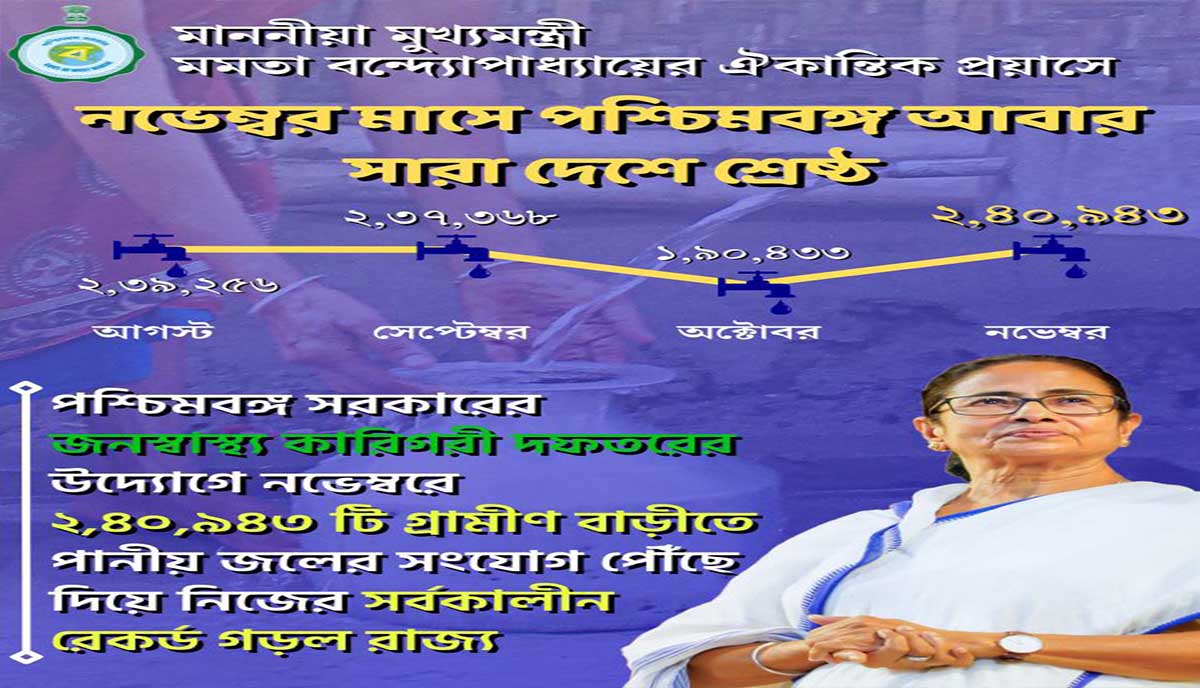 জনস্বাস্থ্য কারিগরি দপ্তর সূত্রে জানা গেছে, নভেম্বর মাসে এই রাজ্যের গ্রামীণ এলাকায় ২ লক্ষ ৪০ হাজার ৯৪৩টি বাড়িতে নলবাহিত পরিস্রুত পানীয় জলের সংযোগ দেওয়া হয়েছে। দেশের আর কোনও রাজ্য নভেম্বর মাসে ২ লক্ষের গণ্ডি ছাড়াতে পারেনি। বিজেপিশাসিত গুজরাটে নভেম্বর মাসে মাত্র ২১৮৪৪টি বাড়িতে পানীয় জলের সংযোগ দেওয়া হয়েছে। রাজস্থানে ৩২৮৩৯, উত্তরপ্রদেশে ৩২৯৯৪, মধ্যপ্রদেশে ১ লাখ ২৯ হাজার ৮১৮, ওড়িশায় ১ লাখ ৪৮ হাজার ২২৭টি বাড়িতে সংযোগ দেওয়া হয়েছে।