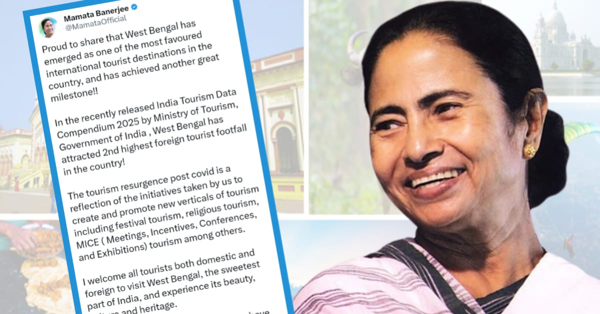 মুখ্যমন্ত্রী (Tourism_Mamata Banerjee) এদিন ‘ইন্ডিয়া টুরিজম ডেটা কম্পেন্ডিয়াম ২০২৫’ (India Tourism Data Compendium 2025)-এর পরিসংখ্যান তুলে ধরেন। তিনি লেখেন, “আমি গর্বের সঙ্গে জানাচ্ছি যে, পশ্চিমবঙ্গ আন্তর্জাতিক পর্যটকদের কাছে অন্যতম পছন্দের গন্তব্য হিসেবে উঠে এসেছে এবং আরও একটি মাইলফলক স্পর্শ করেছে। ভারত সরকারের পর্যটন মন্ত্রকের প্রকাশিত সাম্প্রতিক তথ্য অনুযায়ী, বিদেশি পর্যটকদের আগমনের সংখ্যার বিচারে পশ্চিমবঙ্গ দেশের মধ্যে দ্বিতীয় স্থান অর্জন করেছে।”