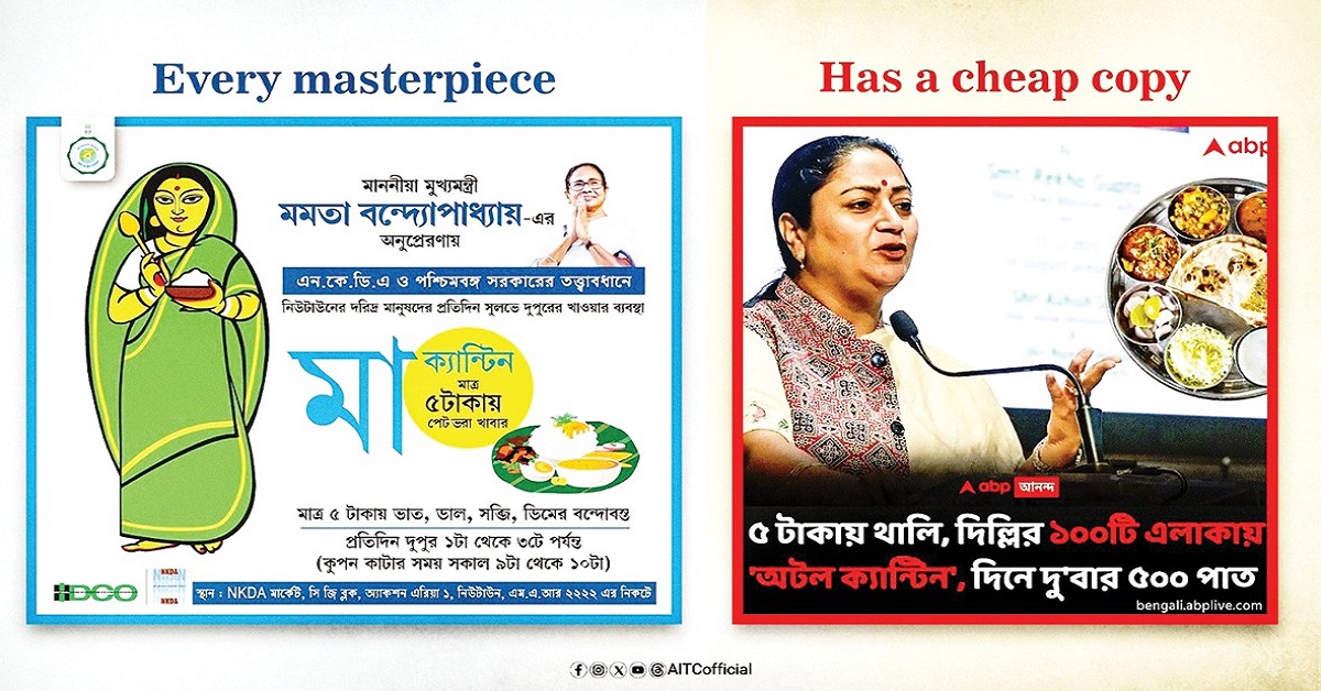নামটাই খালি আলাদা, বাকি সব এক। ৫ টাকায় ভরপেট খাবারের ব্যবস্থা। দিল্লির ১০০টি এলাকায় দিনে দু’বার ৫০০ করে হাজার মানুষকে খাওয়ানোর পরিকল্পনা। মা ক্যান্টিনকে নির্লজ্জের মতো নকল। মমতা বন্দ্যোপাধ্যায় ২০২১ সালে কোভিডের সময় এই ক্যান্টিন শুরু করেন। টানা চার বছর চলছে। প্রমাণিত হচ্ছে মমতা বন্দ্যোপাধ্যায় আজ যা ভাবেন, কাল তা বিজেপি ভাবে।