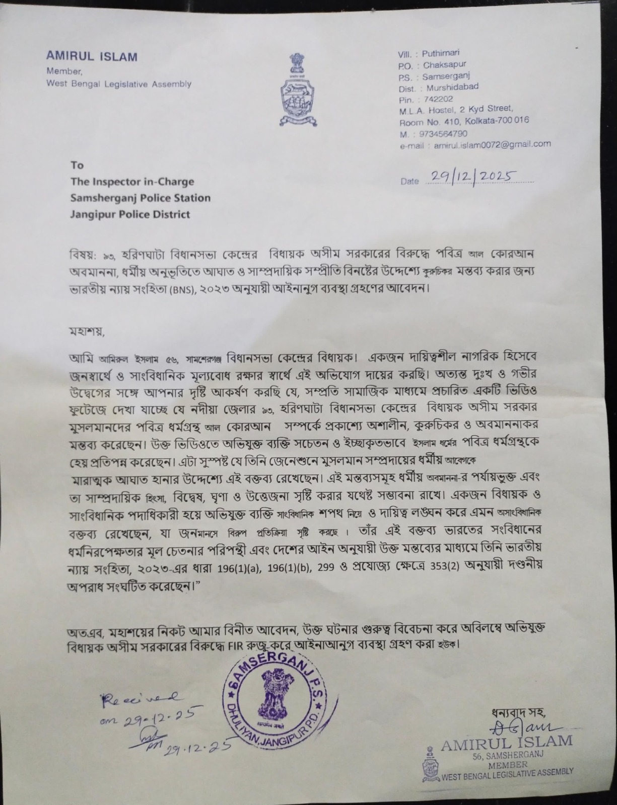 সামশেরগঞ্জের বিধায়ক আমিরুল ইসলাম জঙ্গিপুর থানায় এফআইআর দায়ের করেছেন। মন্ত্রী আখরুজ্জামান এফআইআর দায়ের করেন রঘুনাথগঞ্জ থানায়। সম্প্রতি সামাজিক মাধ্যমে প্রচারিত একটি ভিডিও ফুটেজে দেখা যায়, হরিণঘাটার বিধায়ক অসীম সরকার মুসলমানদের পবিত্র ধর্মগ্রন্থ আল কোরান সম্পর্কে প্রকাশ্যে অশালীন, কুরুচিকর ও অবমাননাকর মন্তব্য করেছেন। এটা মুসলমান সম্প্রদায়ের ধর্মীয় আবেগে আঘাত। সাংবিধানিক পদাধিকারী হিসেবে বিধায়ক অসীম সরকার সাংবিধানিক শপথ নিয়েও দায়িত্ব লঙ্ঘন করেছেন। তাঁর এমন অসাংবিধানিক বক্তব্যে জনমানসে বিরূপ প্রতিক্রিয়া সৃষ্টি হতে পারে । তাঁর এই বক্তব্য ভারতের সংবিধানের ধর্মনিরপেক্ষতার মূল চেতনার পরিপন্থী এবং দেশের আইন অনুযায়ী উক্ত মন্তব্যের মাধ্যমে তিনি ভারতীয় ন্যায় সংহিতা, ২০২৩-এর বিভিন্ন ধারায় দণ্ডনীয় অপরাধ সংঘটিত করেছেন। তাই বিধায়ক অসীম সরকারের বিরুদ্ধে যথাযথ আইনআনুগ ব্যবস্থা গ্রহণ করার আবেদন জানানো হয় এফআইআরে।