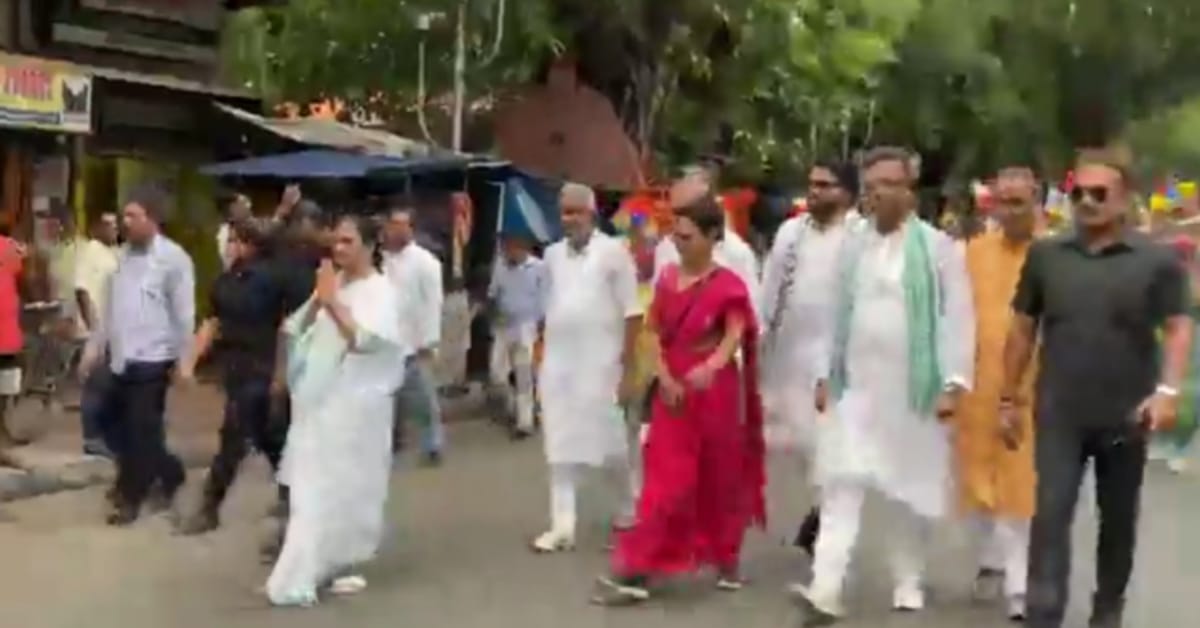 এদিন বর্ণাঢ্য পদযাত্রা করছেন তৃণমূল সুপ্রিমো। শুরুতে সঙ্গে ছিলেন যাদবপুরের প্রার্থী সায়নী ঘোষ, কৃষ্ণনগরের প্রার্থী মহুয়া মৈত্র, বৈশ্বানর চট্টোপাধ্যায়, দেবাশিস কুমার-সহ তৃণমূল নেতৃত্বে। পদযাত্র শুরুর আগে মাইকে হাতে তুলে নেম মমতা বন্দ্যোপাধ্যায়। বলেন, ”সব ঠিক থাকলে, গণনা ঠিকমোত হলে, বিজেপি ক্ষমতায় আসছে না। এত মিথ্যা কথা বলা,আগে কোনও প্রধানমন্ত্রীকে দেখিনি।” মোদিকে তীব্র কটাক্ষ করে তৃণমূল সভানেত্রী বলেন, ”চেয়ারের দাম আছে। চেয়ারকে কেয়ার করে না। আবার দেখবেন প্রচার শেষ হলেই কোথাও না কোথাও বসে পড়ে। ধ্যান করবেন করুন। তার জন্য ক্যামেরা নিয়ে যাবেন কেন? যা হয় মানুষের জন্য ভাল হয়। মোদি যাক দেশ থাক, মোদি যাক, সংবিধান থাক। ভাল থাকবেন, ১২ কিমি হাঁটতে হবে। আবার দেখা হবে।”