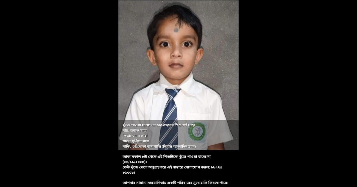 পুলিশ সূত্রে জানা গিয়েছে, হুগলির বলাগড় থানার গুপ্তিপাড়া বাধাগাছি এলাকার বাসিন্দা যাদব ও সুপ্রিয়া সাহার ছেলে স্বর্ণাভ শনিবার সকালে বাড়ি থেকে নিখোঁজ হয়ে যায়। মাকে সে জানিয়েছিল ঠাকুমার ঘরে খেলতে যাচ্ছে। এরপর তার আর কোনও হদিশ পাওয়া যায়নি। সন্ধে পেরিয়ে গেলেও ছেলে না ফেরায় সাহা-দম্পতি অভিযোগ করেন বলাগড় থানায়। হুগলি (গ্রামীণ)-র অতিরিক্ত পুলিশ সুপার কল্যাণ সরকার, ডিএসপি (ক্রাইম) অভিজিৎ সিনহা মহাপাত্র ঘটনাস্থলে পৌঁছন। স্বর্ণাভর হদিশ পেতে ড্রোনের সাহায্যও নেওয়া হয়। স্নিফার ডগের সাহায্যও নেয় পুলিশ। দীর্ঘ তল্লাশির পর রবিবার ভোর পাঁচটা নাগাদ দাদু মাধব সাহার বাথরুমে শিশুটিকে অচৈতন্য অবস্থায় পড়ে থাকতে দেখা যায়। স্থানীয় হাসপাতালে নিয়ে গেলে সেখানে চিকিৎসক তাকে মৃত বলে ঘোষণা করে। ময়নাতদন্তের জন্য দেহ পাঠানো হয়েছে।