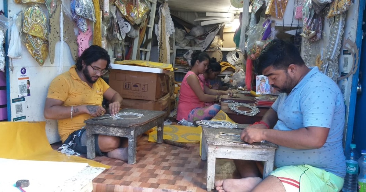 অনুরাধা রায়: থিমের ভিড়ে হারিয়ে যাননি তাঁরা। বরং বেড়েছে কাজের পরিমাণ। ভাল আছেন কুমোরটুলির জরি শিল্পীরা। দু’বছর করোনার কারণে ভাটা পড়েছিল কাজে। কিন্তু এই বছর ফিরে এসেছে চেনা ব্যস্ততা। প্রতিমা শিল্পীদের সঙ্গে তাল মিলিয়েই চলছে তাঁদের কাজ। তৈরি হচ্ছে মুকুট, কানবালা, সীতাহার। কয়েক পুরুষ ধরে জরি শিল্পের (Brocade Industry) সঙ্গে যুক্ত শিল্পী প্রদীপ দের পরিবার। এখন তাঁর ছেলে প্রসূন দেও এসেছেন বাবা-ঠাকুরদা-র এই শিল্পে। কুমোরটুলির কয়েকটি গলি পেরিয়ে তাঁদের জরি (Brocade Industry) কারখানায় এখন চরম ব্যস্ততা। কাঠের টুলের ওপর বসে আর্ট পেপারে একের পর এক নকশা নিমেষে এঁকে ফেলছেন ষাটোর্ধ্ব প্রদীপ দে। জরি বসিয়ে সেই ডিজাইন কোনওটা হচ্ছে প্রতিমার মুকুট, কোনটা আবার হার, বা রতনচূড়। বছর ২০-২২-এর ছেলেমেয়েদের সেই গয়না তৈরির তালিম দিচ্ছেন প্রদীপবাবুর ছেলে প্রসূন। এখন তো থিমের রমরমা। তার সঙ্গে সামঞ্জস্য রেখেই হয় প্রতিমার গয়না। জরির বাজার কেমন? শিল্পী প্রদীপ দে নকশা আঁকতে আঁকতেই বললেন, আমাদের বাজারে কোনও ভাটা পড়েনি। বরং দিন দিন বেড়েছে ব্যস্ততা। থিম যতই হোক প্রতিমার সাজে জরি লাগেই। তবে করোনার সময় খুব খারাপ দিন গিয়েছে। এবার আবার সব স্বাভাবিক। ইতিমধ্যেই বাংলাদেশে গিয়েছে আমাদের কাজ। এরপর যাবে মধ্যপ্রদেশেও। কলকাতা বা জেলায় তো আমাদের তৈরি প্রতিমার গয়না প্রচুর যায়। শিল্পীদের জন্য এগিয়ে এসেছে রাজ্য সরকার। নতুন প্রজন্মও জরির গয়না তৈরিতে আগ্রহ দেখাচ্ছে। আমার ছেলে তার উদাহরণ। আগামী প্রজন্মের আগ্রহ তৈরি করতে পারছি, এটাই আমাদের কাছে বড় পাওনা।