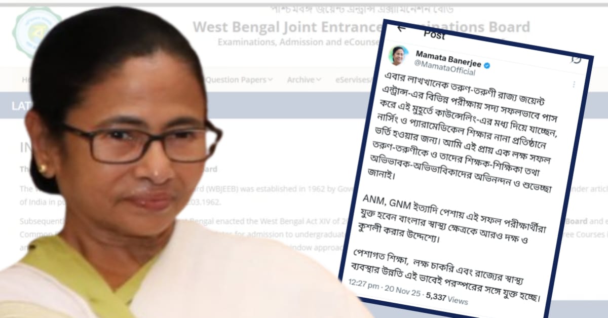 ”এবার লাখখানেক তরুণ-তরুণী রাজ্য জয়েন্ট এন্ট্রান্স-এর বিভিন্ন পরীক্ষায় সদ্য সফলভাবে পাস করে এই মুহূর্তে কাউন্সেলিং-এর মধ্য দিয়ে যাচ্ছেন, নার্সিং ও প্যারামেডিকেল শিক্ষার নানা প্রতিষ্ঠানে ভর্তি হওয়ার জন্য। আমি এই প্রায় এক লক্ষ সফল তরুণ-তরুণীকে ও তাদের শিক্ষক-শিক্ষিকা তথা অভিভাবক-অভিভাবিকাদের অভিনন্দন ও শুভেচ্ছা জানাই। ANM, GNM ইত্যাদি পেশায় এই সফল পরীক্ষার্থীরা যুক্ত হবেন বাংলার স্বাস্থ্য ক্ষেত্রকে আরও দক্ষ ও কুশলী করার উদ্দেশ্যে। পেশাগত শিক্ষা, লক্ষ চাকরি এবং রাজ্যের স্বাস্থ্য ব্যবস্থার উন্নতি এই ভাবেই পরস্পরের সঙ্গে যুক্ত হচ্ছে।”