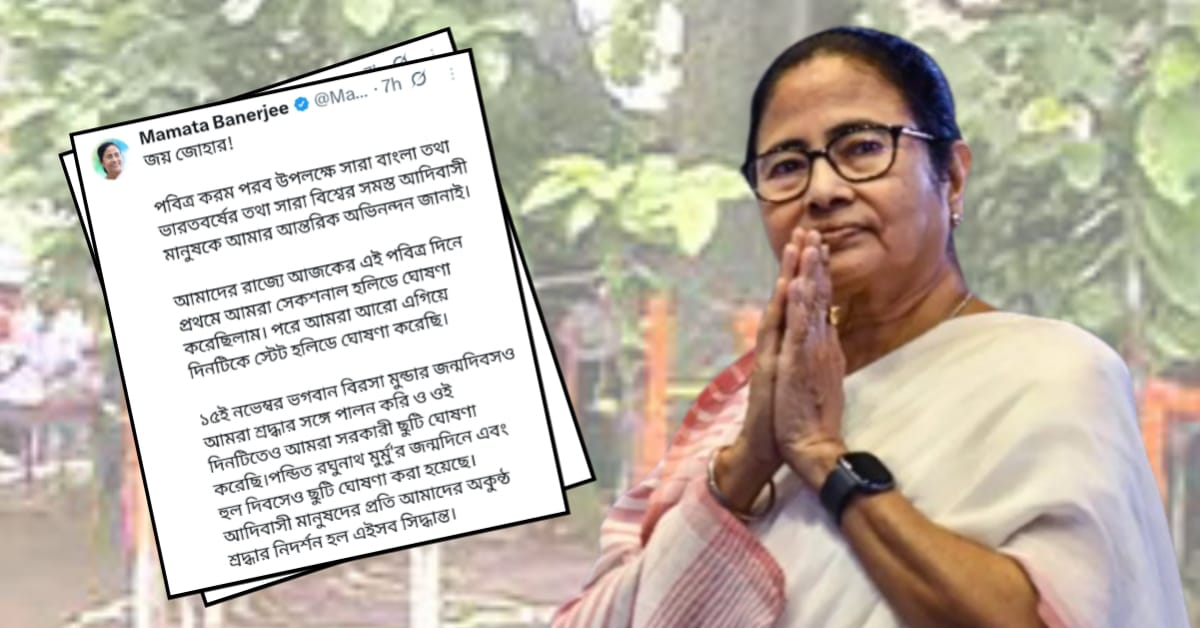 ১৫ নভেম্বর ভগবান বিরসা মুন্ডার জন্মদিবসও আমরা শ্রদ্ধার সঙ্গে পালন করি ও ওই দিনটিতেও আমরা সরকারী ছুটি ঘোষণা করেছি। পন্ডিত রঘুনাথ মুর্মু’র জন্মদিনে এবং হুল দিবসেও ছুটি ঘোষণা করা হয়েছে। আদিবাসী মানুষদের প্রতি আমাদের অকুন্ঠ শ্রদ্ধার নিদর্শন হল এইসব সিদ্ধান্ত।”