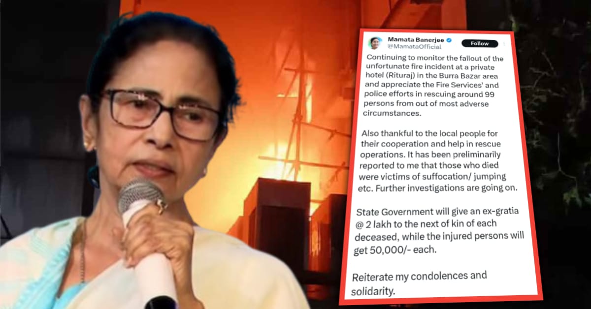 এক্স হ্যান্ডেলে মুখ্যমন্ত্রী জানিয়েছেন, “বড়বাজার (Burrabazar Fire) এলাকার একটি বেসরকারি হোটেল (ঋতুরাজ) -এ দুর্ভাগ্যজনক অগ্নিকাণ্ডের ঘটনায় প্রায় ৯৯ জনকে সবচেয়ে প্রতিকূল পরিস্থিতি থেকে উদ্ধার করার জন্য ফায়ার সার্ভিস এবং পুলিশের প্রচেষ্টার প্রশংসা করছি। স্থানীয়দের সহযোগিতা এবং উদ্ধার অভিযানে সাহায্যের জন্যও কৃতজ্ঞতা জানাচ্ছি। প্রাথমিকভাবে আমাকে জানানো হয়েছে যে, যারা মারা গিয়েছেন তারা শ্বাসরোধ/লাফিয়ে পড়া ইত্যাদি কারণে তাদের মৃত্যু হয়েছে। তদন্ত চলছে। রাজ্য সরকার নিহতদের পরিবারকে ২ লক্ষ টাকা করে ক্ষতিপূরণ দেবে, আহতদের প্রত্যেককে ৫০,০০০ টাকা করে দেওয়া হবে।”