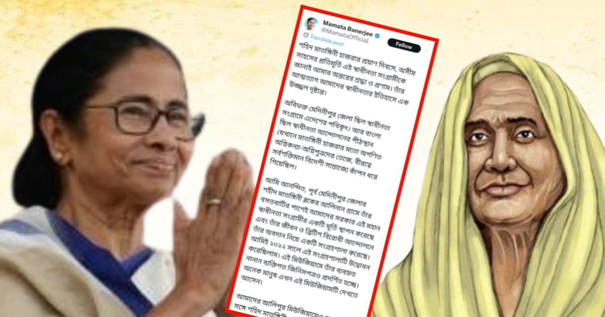 এক্স হ্যান্ডেলে মুখ্যমন্ত্রী জানিয়েছেন,”শহিদ মাতঙ্গিনী হাজরার (Matangini Hazra) প্রয়াণ দিবসে, অসীম সাহসের প্রতিমূর্তি এই স্বাধীনতা সংগ্রামীকে জানাই আমার অন্তরের শ্রদ্ধা ও প্রণাম। তাঁর আত্মত্যাগ আমাদের স্বাধীনতার ইতিহাসে এক উজ্জ্বল দৃষ্টান্ত।