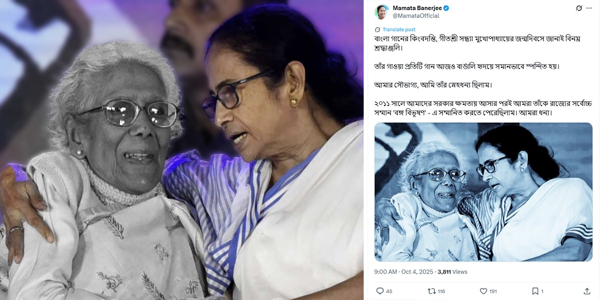 আজ সন্ধ্যা মুখোপাধ্যায়ের জন্মদিবস উপলক্ষে বাংলার মুখ্যমন্ত্রী মমতা বন্দ্যোপাধ্যায় নিজের সোশ্যাল হ্যান্ডেলে তাঁকে শ্রদ্ধা জানিয়ে লেখেন, ”বাংলা গানের কিংবদন্তি, গীতশ্রী সন্ধ্যা মুখোপাধ্যায়ের জন্মদিবসে জানাই বিনম্র শ্রদ্ধাঞ্জলি। তাঁর গাওয়া প্রতিটি গান আজও বাঙালি হৃদয়ে সমানভাবে স্পন্দিত হয়।আমার সৌভাগ্য, আমি তাঁর স্নেহধন্য ছিলাম। ২০১১ সালে আমাদের সরকার ক্ষমতায় আসার পরই আমরা তাঁকে রাজ্যের সর্বোচ্চ সম্মান ‘বঙ্গ বিভূষণ’ – এ সম্মানিত করতে পেরেছিলাম। আমরা ধন্য।”