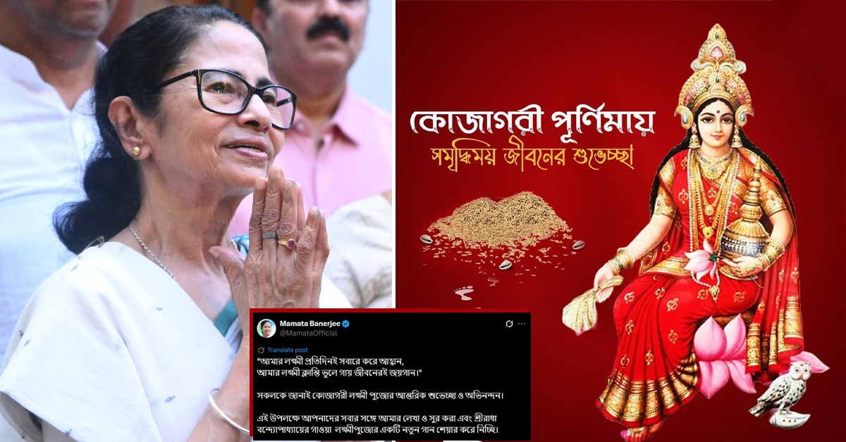 আজ কোজাগরী লক্ষ্মীপুজো (Lakshmipuja)। দুর্গোৎসবের পর আশ্বিন মাসের শুক্লপক্ষের শেষে পূর্ণিমা তিথিতে কোজাগরী লক্ষ্মী পুজো করা হয়। নিজের সামর্থ মতোই বাংলার ঘরে ঘরে আজ ধনদেবীর আরাধনায় মেতে উঠবেন সকলে ৷ সাধারণ গৃহস্থ থেকে সেলিব্রিটি সব জায়গাতেই হবে লক্ষ্মী বন্দনা। এই উপলক্ষে নিজের সোশ্যাল হ্যান্ডেলে সকলকে শুভেচ্ছা জানালেন বাংলার মুখ্যমন্ত্রী মমতা বন্দ্যোপাধ্যায় (Mamata Banerjee)। নিজের লেখা ও সুরে শ্রীরাধা বন্দ্যোপাধ্যায়ের গাওয়া একটি গান তিনি পোস্ট করেন তিনি। সেখানে লেখেন,