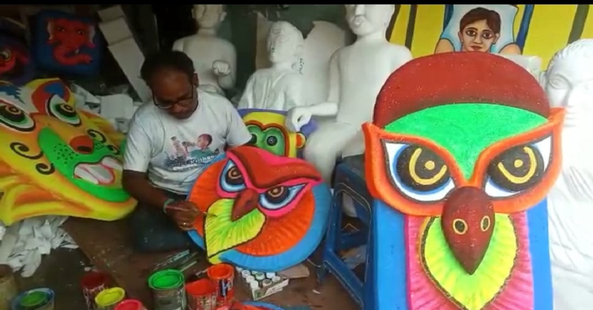 থিমের সাথে সামঞ্জস্য রেখে তৈরি হচ্ছে প্রতিমা। এখানে অসুর একজন রিং মাস্টার। মা দুর্গা তাঁর উপর দাঁড়িয়ে। বাজেট আট লাখ টাকার মতো।
