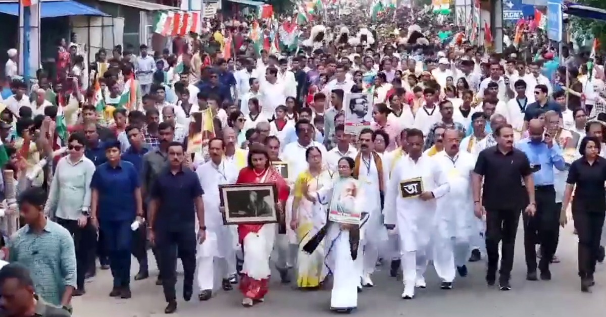 প্রথমে বাংলা অক্ষরের কাটআউট নিয়ে পদযাত্রা। তারপর রবীন্দ্রনাথের ছবি হাতে বোলপুরে ভাষা-মিছিলে মমতা বন্দ্যোপাধ্যায় (Mamata banerjee)। বিজেপির রাজ্যে বাঙালিদের উপর অত্যাচার! একুশে জুলাইয়ের মঞ্চে ভাষা আন্দোলনের ডাক দিয়েছিলেন মমতা বন্দ্যোপাধ্যায়। টুরিস্ট লজ মোড় থেকে জামবনি বাসস্ট্যান্ড মিছিল ছিল।