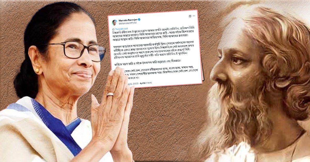 এক্স হ্যান্ডেলে মুখ্যমন্ত্রী (CM Mamata Banerjee) লিখেছেন, “বিশ্বকবি রবীন্দ্রনাথ ঠাকুরের চরণে আমার প্রণতি জানাই। প্রতিদিন, প্রতিক্ষণ তিনি আমাদের অন্তরে থাকেন। তিনি আমাদের প্রাণের কবি – আজ তাঁকে বিশেষভাবে অন্তরে আহ্বান করি। তিনি আমাদের অভিভাবক, তিনি আমাদের ধ্রুবতারা।