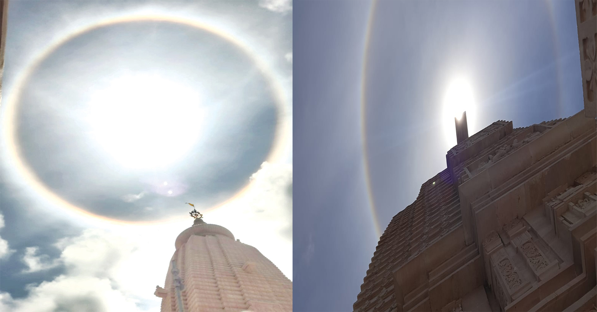 সকাল ১১টা : বুধবার সকাল ১১টা নাগাদ জগন্নাথধামের (Jagannath dham) চূড়ায় দেখা যায় এই দৃশ্য। প্রায় ঘণ্টাখানেক স্থায়ী ছিল আলোকবৃত্তটি। জন্মাষ্টমীর ক’দিন আগে এই ধরনের মহাজাগতিক ঘটনায় অনেকেই আধ্যাত্মিকতায় বুঁদ হয়ে পড়েন। ছবি ফোনবন্দি করতে হুড়োহুড়ি পড়ে যায় পর্যটকদের মধ্যে। জেলার বিভিন্ন প্রান্ত থেকে দেখা গিয়েছে। সোলার হ্যালো মিলিয়ে যাওয়ার পরেই কয়েক জায়গায় নামে বৃষ্টি।