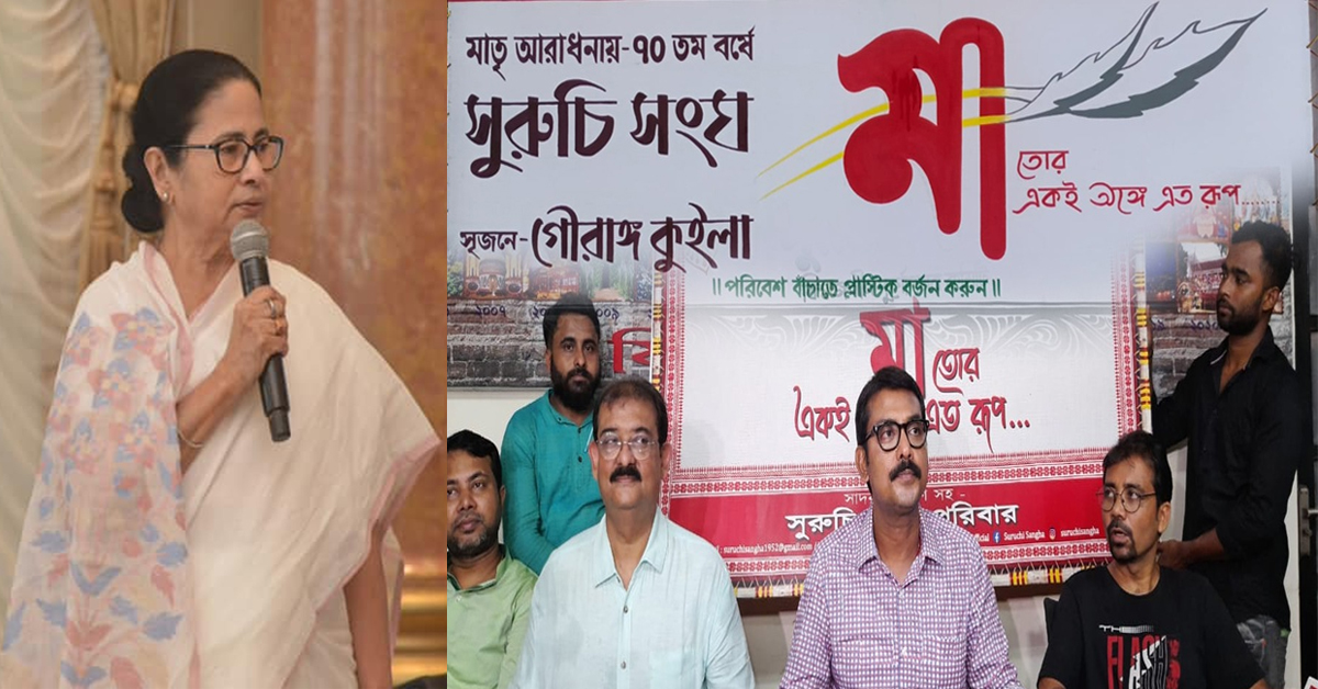 চলতি বছর ৭০-এ পা দিল সুরুচি সংঘের পুজো। এদিন, থিমের ক্যাচলাইন প্রকাশিত হয়। এবছর তাদের থিম ‘মা তোর একই অঙ্গে এত রূপ’। প্লাস্টিক মুক্ত পরিবেশের বার্তা দেওয়া হয়েছে সুরুচির এবারের পুজোয়। সেই নামের সঙ্গে সাযুজ্য রেখেই থিম সং লিখেছেন মুখ্যমন্ত্রী।