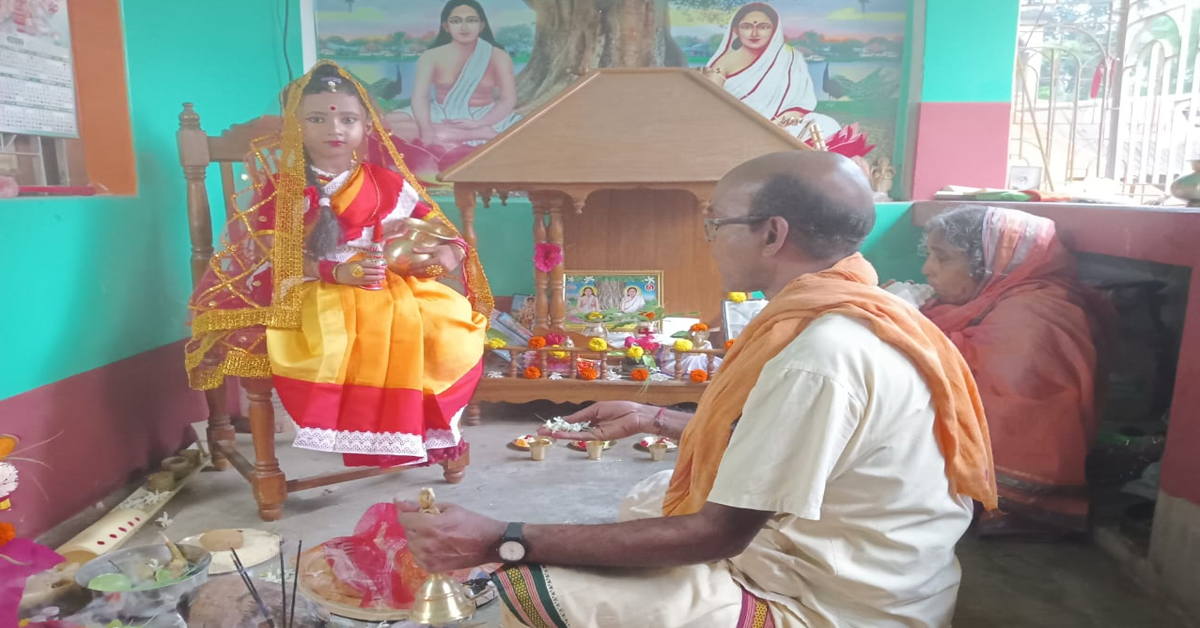 মৌসুমী দাস পাত্র, নদিয়া: শিশু নির্যাতন ও নারীধর্ষণ রুখতে নিজেদের সাড়ে ৪ বছরের একরত্তি কন্যাকে লক্ষ্মীরূপে আরাধনা করলেন কৃষ্ণগঞ্জের বাগচী-দম্পতি। কন্যা আরিত্রিকাকে লক্ষ্মী (Lakshmi Puja) রূপে পুজো করে অভিনব উপায়ে নারী নির্যাতনের প্রতিবাদ জানালেন ভারত-বাংলাদেশ সীমান্তবর্তী কৃষ্ণগঞ্জের নাঘাটা পাড়া এলাকার বাসিন্দা শিক্ষক অর্জুন বাগচীর পরিবার। লক্ষ্মীপূর্ণিমার পুণ্য তিথিতে ধন-ম্পদ লাভের আশায় লক্ষ্মীর আরাধনায় মানুষ যখন ব্রতী, সেই সময় একরত্তি শিশুকন্যাকে লক্ষ্মীর আদলে সাজিয়ে ধর্মীয় রীতি মেনে তাকে পুজো করে পৃথিবী থেকে শিশু নির্যাতন ও নারীধর্ষণের মতো অসামাজিক ঘটনা যাতে আর না ঘটে সে জন্য লক্ষ্মীর কাছে কাছে প্রার্থনা জানালেন বাগচী দম্পতি। তাঁদের ঠাকুরঘরের সিংহাসনে মা লক্ষ্মীর প্রতিকৃতির সামনেই নিজেদের শিশুকন্যাকে লক্ষ্মী সাজিয়ে পুরোহিত ডেকে পুজো (Lakshmi Puja) করলেন বাগচী পরিবারের সদস্যরা। ছোট্ট আরিত্রিকাকে হলুদ শাড়ি পরিয়ে হাতে পিতলের কলসি দেওয়া হয়। পেশায় হাইস্কুলের শিক্ষক অর্জুন বাগচী বলেন, ‘কন্যার জন্মের পর থেকে আমাদের সংসারে উন্নতি হয়। তাই ও আমাদের ঘরের লক্ষ্মী। আজও মেয়েদের উপর নানা অত্যাচার চলে। শিশু নির্যাতন ও নারীধর্ষণ রুখতে পুজোর মাধ্যমেই বার্তা দিতে চেয়েছি, মেয়েদের প্রতিটি স্তরে যেন সম্মান দেওয়া হয়।’ মা ঝুমা বাগচী বলেন, ‘মেয়েসন্তানকে পরিবারের লক্ষ্মী হিসাবে গণ্য করা হয়। এছাড়াও নারীকে মাতৃশক্তি রূপে মানা হয়। সেই কারণেই মৃন্ময়ী মূর্তির বদলে ঘরের মেয়েকেই লক্ষ্মীরূপে আরাধনা করার সিদ্ধান্ত নিই আমরা।’ বাগচী-দম্পতির এই পুজো দেখতে ভিড় জমান প্রতিবেশীরা।