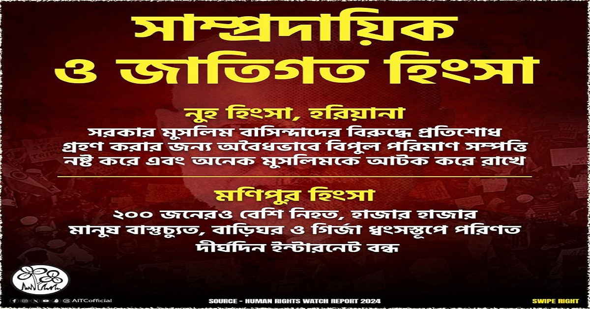 সংখ্যালঘু এলাকার মানুষদের বিপুল সম্পত্তি নষ্ট ও সংখ্যালঘুদের মানুষদের উপর নির্যাতন চালিয়েছে বিজেপি। কেন্দ্রে বিজেপি শাসনকালেই মাসের পর মাস ধরে অশান্ত বিজেপিশাসিত রাজ্য মণিপুর। জাতিগত হিংসা, খুন, ধর্ষণ, অপহরণ, লুঠপাট, উচ্ছেদ, গির্জায় অগ্নিসংযোগ-সহ মানবাধিকার লঙ্ঘনের অসংখ্য ঘটনা হয়ে চলেছে উত্তর-পূর্বের এই রাজ্যে। মণিপুরের হিংসায় ২০০ জনেরও বেশি মানুষ প্রাণ হারিয়েছেন, হাজার হাজার মানুষ বাস্তুচ্যুত, বাড়ি-ঘর, গির্জা সব ধ্বংসস্তূপে পরিণত হয়েছে বিজেপি জমানায়। তৃণমূলের অভিযোগ, দেশজুড়ে এমনই অসংখ্য মানবাধিকার লঙ্ঘনের ঘটনা ঘটিয়ে দশবছর ধরে স্বৈরাচারী, সাম্প্রদায়িক সরকার চালাচ্ছেন নরেন্দ্র মোদি।