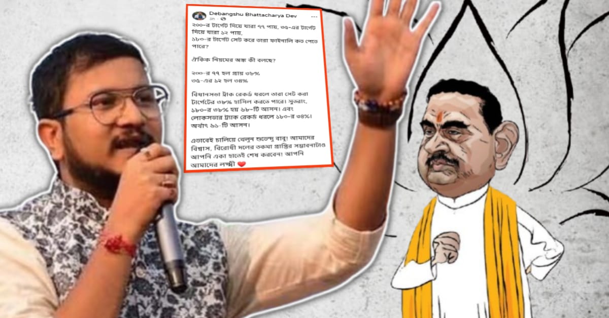 আব কি বার, দোশো পার। একুশের বিধানসভা ভোটের আগে স্লোগান তুলেছিল বিজেপি। নিট ফল কী হয়েছিল? বিজেপি পেয়েছিল সাকুল্যে ৭৭। আবার ২৪-এর লোকসভায় বিজেপি আওয়াজ তুলেছিল ৪২ এ ৩৫। বিজেপি পেয়েছিল ১২। আর ২৬-এ বিরোধী দলনেতা গদ্দার অধিকারী যখন ১৮০-র টার্গেট দিচ্ছেন, কটাক্ষের সুরে তৃণমূলের আইটি সেলের চেয়ারম্যান দেবাংশু ভট্টাচার্য (Debangshu Bhattacharya) ঐকিক নিয়মে অংক কষে দেখিয়ে দিলেন বিজেপির আসল সংখ্যা কত হতে পারে।