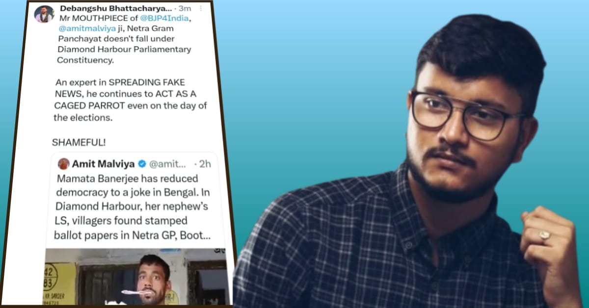 এরপরই মালব্যকে ট্যুইটারে পাল্টা দেন তৃণমূলের সোশ্যাল মিডিয়া সেলের প্রধান দেবাংশু ভট্টাচার্য। মালব্যকে পালটা দিয়ে দেবাংশু বলেন, উনি যে নেতড় গ্রাম পঞ্চায়েতের উল্লেখ করেছেন, তা ডায়মন্ড হারবার সংসদীয় কেন্দ্রের মধ্যেই পড়ে না। একজন ফেক নিউজ বিশেষজ্ঞ হিসেবে তিনি তাঁর কাজ চালিয়ে যাচ্ছেন। নির্বাচনের দিনও তিনি খাঁচায় ভরা তোতাপাখির মতো কথা বলছেন।