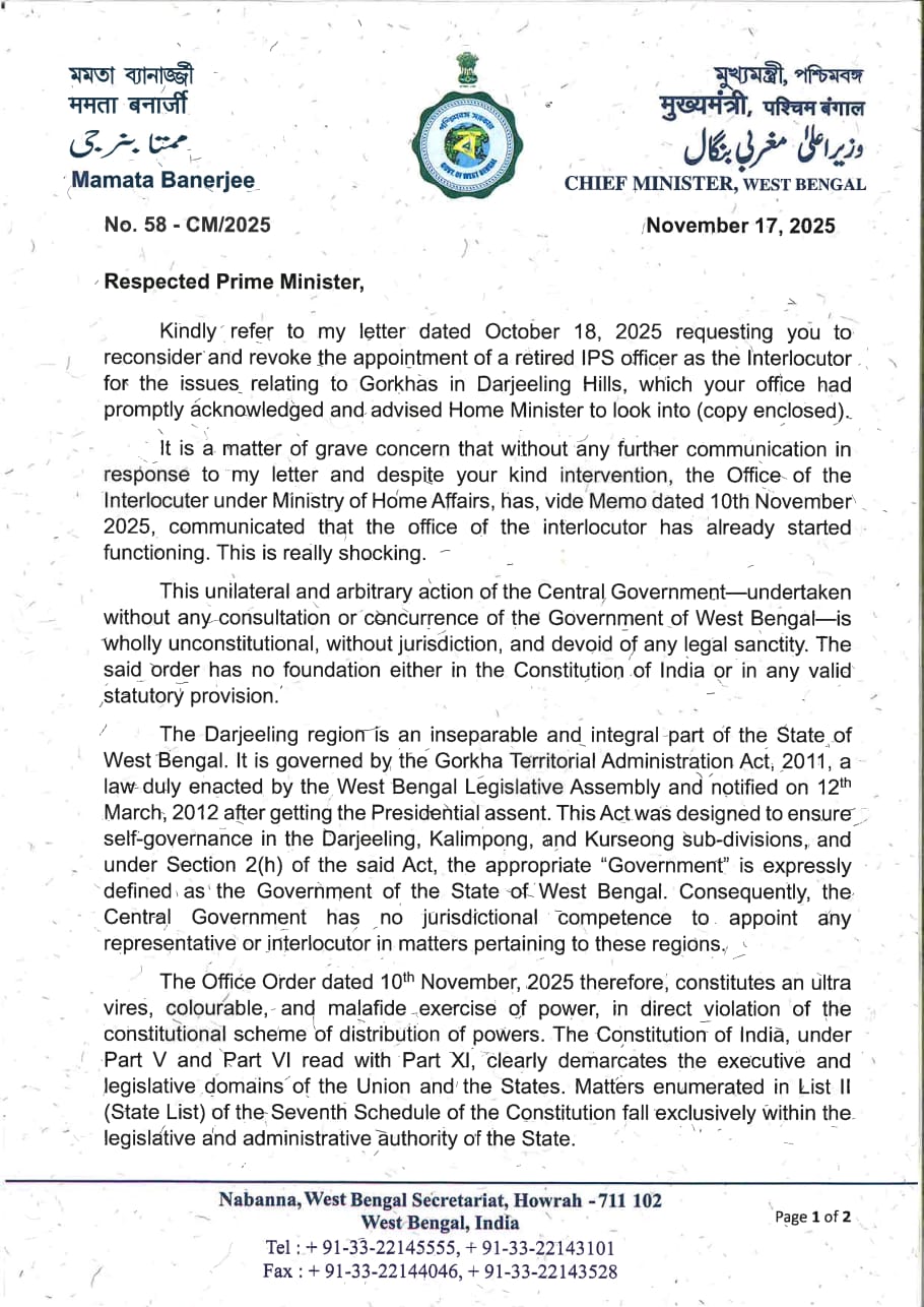 কেন্দ্রকে পাঠানো চিঠিতে মমতা বন্দ্যোপাধ্যায় জানিয়েছেন, তিনি ১৮ অক্টোবর প্রধানমন্ত্রীকে এই নিয়ে প্রথম চিঠি পাঠিয়েছিলেন এবং তাঁদের পদক্ষেপ পুনর্বিবেচনা করার অনুরোধ করেছিলেন। কিন্তু কোনও প্রতিক্রিয়া পাওয়া যায় নি। ১০ নভেম্বর কেন্দ্রীয় স্বরাষ্ট্র মন্ত্রকের পক্ষ থেকে জানানো হয়—ইন্টারলোকিউটরের অফিস ইতিমধ্যেই কাজ শুরু করে দিয়েছে। মুখ্যমন্ত্রী মনে করছেন কেন্দ্রের তরফে এই আচরণ অত্যন্ত বিস্ময়কর ও উদ্বেগজনক। দার্জিলিং রাজ্যের বিষয়, কেন্দ্রের একেবারেই নয়। চিঠিতে মুখ্যমন্ত্রী জানিয়েছেন যে দার্জিলিং, কালিম্পং ও কার্শিয়াং পশ্চিমবঙ্গের অবিচ্ছেদ্য অংশ। গোরখা টেরিটোরিয়াল অ্যাডমিনিস্ট্রেশন (জিটিএ) অ্যাক্ট, ২০১১ অনুযায়ী পাহাড়ের প্রশাসনিক বিষয় রাজ্যের আওতায়। সেই আইনে ‘Government; বলতে পশ্চিমবঙ্গ সরকারকে বোঝায়। তাই পাহাড়ের বিষয়ে ইন্টারলোকিউটার নিয়োগ করার মতো ক্ষমতা কেন্দ্রের নেই। চিঠিতে তিনি স্পষ্ট জানান ‘এই সিদ্ধান্ত আইনবহির্ভূত, সংবিধানের পরিপন্থী এবং ক্ষমতার অপপ্রয়োগ।’ মুখ্যমন্ত্রীর দাবি কেন্দ্রের এই পদক্ষেপ বেআইনি তো বটেই উল্টে দার্জিলিং পাহাড়ে দীর্ঘদিনের শান্ত পরিবেশকে অস্থির করে তোলার সম্ভাবনাও তৈরি করছে। ২০১১ সালের পর থেকে পাহাড়ে যেভাবে শান্তি ও উন্নয়ন এগিয়েছে, নিজেদের রাজনৈতিক স্বার্থে সেটা বাধাগ্রস্ত করতে চাইছে কেন্দ্রের স্বৈরাচারী সরকার। চিঠিতে মুখ্যমন্ত্রী লেখেন, “রাজ্যের আইনগত অধিকার যেখানে স্পষ্টভাবে নির্ধারণ করা আছে সেখানে কেন্দ্রের এমন হস্তক্ষেপ দেশের ফেডারেল কাঠামোর প্রতি আঘাত।”