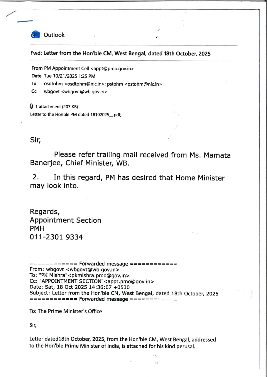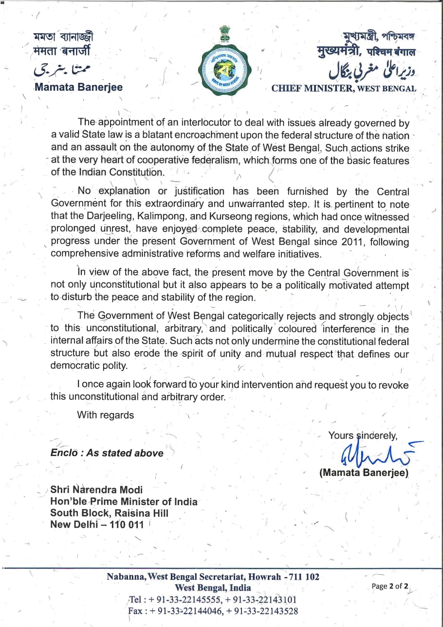 কেন্দ্রকে পাঠানো চিঠিতে মমতা বন্দ্যোপাধ্যায় জানিয়েছেন, তিনি ১৮ অক্টোবর প্রধানমন্ত্রীকে এই নিয়ে প্রথম চিঠি পাঠিয়েছিলেন এবং তাঁদের পদক্ষেপ পুনর্বিবেচনা করার অনুরোধ করেছিলেন। কিন্তু কোনও প্রতিক্রিয়া পাওয়া যায় নি। ১০ নভেম্বর কেন্দ্রীয় স্বরাষ্ট্র মন্ত্রকের পক্ষ থেকে জানানো হয়—ইন্টারলোকিউটরের অফিস ইতিমধ্যেই কাজ শুরু করে দিয়েছে। মুখ্যমন্ত্রী মনে করছেন কেন্দ্রের তরফে এই আচরণ অত্যন্ত বিস্ময়কর ও উদ্বেগজনক। দার্জিলিং রাজ্যের বিষয়, কেন্দ্রের একেবারেই নয়। চিঠিতে মুখ্যমন্ত্রী জানিয়েছেন যে দার্জিলিং, কালিম্পং ও কার্শিয়াং পশ্চিমবঙ্গের অবিচ্ছেদ্য অংশ। গোরখা টেরিটোরিয়াল অ্যাডমিনিস্ট্রেশন (জিটিএ) অ্যাক্ট, ২০১১ অনুযায়ী পাহাড়ের প্রশাসনিক বিষয় রাজ্যের আওতায়। সেই আইনে ‘Government; বলতে পশ্চিমবঙ্গ সরকারকে বোঝায়। তাই পাহাড়ের বিষয়ে ইন্টারলোকিউটার নিয়োগ করার মতো ক্ষমতা কেন্দ্রের নেই। চিঠিতে তিনি স্পষ্ট জানান ‘এই সিদ্ধান্ত আইনবহির্ভূত, সংবিধানের পরিপন্থী এবং ক্ষমতার অপপ্রয়োগ।’ মুখ্যমন্ত্রীর দাবি কেন্দ্রের এই পদক্ষেপ বেআইনি তো বটেই উল্টে দার্জিলিং পাহাড়ে দীর্ঘদিনের শান্ত পরিবেশকে অস্থির করে তোলার সম্ভাবনাও তৈরি করছে। ২০১১ সালের পর থেকে পাহাড়ে যেভাবে শান্তি ও উন্নয়ন এগিয়েছে, নিজেদের রাজনৈতিক স্বার্থে সেটা বাধাগ্রস্ত করতে চাইছে কেন্দ্রের স্বৈরাচারী সরকার। চিঠিতে মুখ্যমন্ত্রী লেখেন, “রাজ্যের আইনগত অধিকার যেখানে স্পষ্টভাবে নির্ধারণ করা আছে সেখানে কেন্দ্রের এমন হস্তক্ষেপ দেশের ফেডারেল কাঠামোর প্রতি আঘাত।”