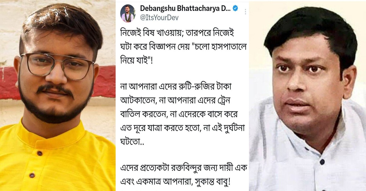 এই অবস্থায় সুকান্ত মজুমদারের মন্তব্য ঘিরে শুরু হয় রাজনৈতিক চাপানউতোর। তিনি তৃণমূল কংগ্রেস নেতৃত্বের বিমানে যাওয়া আর কর্মীদের বাসে দিল্লি যাওয়ার মধ্যে তফাৎ প্রকাশ্যে আনেন। এই সূত্র ধরেই এদিন এক্সে দেবাংশু ভট্টাচার্য লেখেন, ‘নিজেই বিষ খাওয়ায় তারপরে নিজেই ঘটা করে বিজ্ঞাপন দেয় ”চলো হাসপাতালে নিয়ে যাই”। না, আপনারা এদের রুটি রুজির টাকা আটকাতেন, না, আপনারা এদের ট্রেন বাতিল করতেন, না, এদেরকে বাসে করে এত দূরে যাত্রা করতে হত, না এই দুর্ঘটনা ঘটত। এদের প্রত্যেকটা রক্তবিন্দুর জন্য দায়ী এক এবং একমাত্র আপনারা সুকান্ত বাবু।’