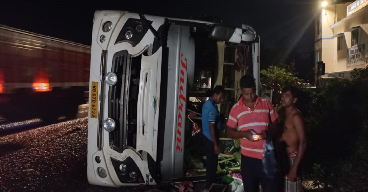 সংবাদদাতা, হাওড়া : নদিয়ার ধানতলা থেকে দিঘা বেড়াতে যাবার পথে উল্টে গেল পর্যটকবোঝাই বাস। ঘটনায় বাসের মধ্যে থাকা ৪০ জন জখম হয়েছেন। সোমবার ভোররাতে বাগনানের চন্দ্রপুরে বম্বে রোডে (১৬ নম্বর জাতীয় সড়ক) দুর্ঘটনাটি ঘটেছে। পুলিশ ও স্থানীয় সূত্রে জানা গেছে, দ্রুতগতিতে যাবার পথে নিয়ন্ত্রণ হারিয়ে ডিভাইডারে ধাক্কা মেরে উল্টে যায় বাসটি। তখন অনেকেই চলন্ত বাসের ভেতর তন্দ্রাচ্ছন্ন অবস্থায় ছিলেন। আচমকা বাস উল্টে যাওয়ার বিকট শব্দে আর্তনাদ করে ওঠেন যাত্রীরা। জাতীয় সড়কে টহলরত পুলিশকর্মীরা ছুটে আসেন।