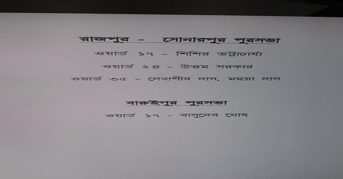 বহিষ্কৃতরা হলেন রাজপুর-সোনাপুর পুরসভার শিশির ভট্টাচার্য, উত্তম সরকার, দেবাশিস দাস, মহুয়া দাস। বারুইপুরে আছেন বাসুদেব ঘোষ। আগামী ২৪ ঘন্টার মধ্যে যদি এরা লিফলেট বিলি করে তৃণমূল কংগ্রেস প্রার্থীদের সমর্থনে প্রচার করলে দল আজকের সিদ্ধান্ত পুনর্বিবেচনার পথে হাঁটতে পারে।