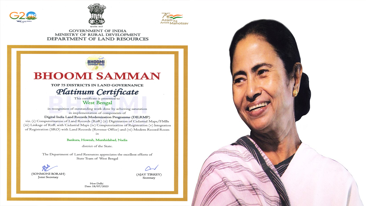 আগেও রাষ্ট্রপতির কাছ থেকে প্ল্যাটিনাম পুরষ্কার পেয়েছে ‘দুয়ারে সরকার’ প্রকল্প। আবার কেন্দ্রের ইলেকট্রনিক্স এবং আইটি দফতর ‘ডিজিটাল ইন্ডিয়া’ পুরষ্কারের ‘পাবলিক প্ল্যাটফর্ম’ বিভাগে প্ল্যাটিনাম পুরষ্কার দিয়েছে বাংলাকে। প্রশাসনিক সূত্রের খবর, পুরস্কার প্রাপক জেলা গুলিতে ভূমি (Bhoomi Samman) সংক্রান্ত বিভিন্ন কাজ যেমন- জমির নথিভুক্তিকরণ, ভূমি কর সম্পর্কিত মানচিত্র, জমির রেকর্ড ইত্যাদি ডিজিটালাইজেশনে উল্লেখযোগ্য সাফল্যের কারণেই তাদেরই এই সম্মানে ভূষিত করা হয়। গোটা দেশের মোট ৭৫টি জেলাকে এই সম্মান দেওয়া হয়েছে। যার মধ্যে ১১টি বাংলার। জমি সক্রান্ত বিভিন্ন তথ্যের ১০০ শতাংশ ডিজিটালাইজেশন সম্পন্ন, এই জেলাগুলি ‘প্ল্যাটিনাম জেলা’র তালিকায় স্থান পেয়েছে। সেই তালিকায় রয়েছে- বাঁকুড়া, হাওড়া, মুর্শিদাবাদ, নদিয়া, হুগলি, উত্তর ২৪ পরগনা, দক্ষিণ ২৪ পরগনা, পূর্ব মেদিনীপুর, পশ্চিম মেদিনীপুর, ঝাড়গ্রাম ও পুরুলিয়া। এই সব জেলার প্রায় ১০০ শতাংশ ভূমি সংক্রান্ত তথ্যের ডিজিটাইলজেশনের কাজ শেষ হয়ে গিয়েছে।