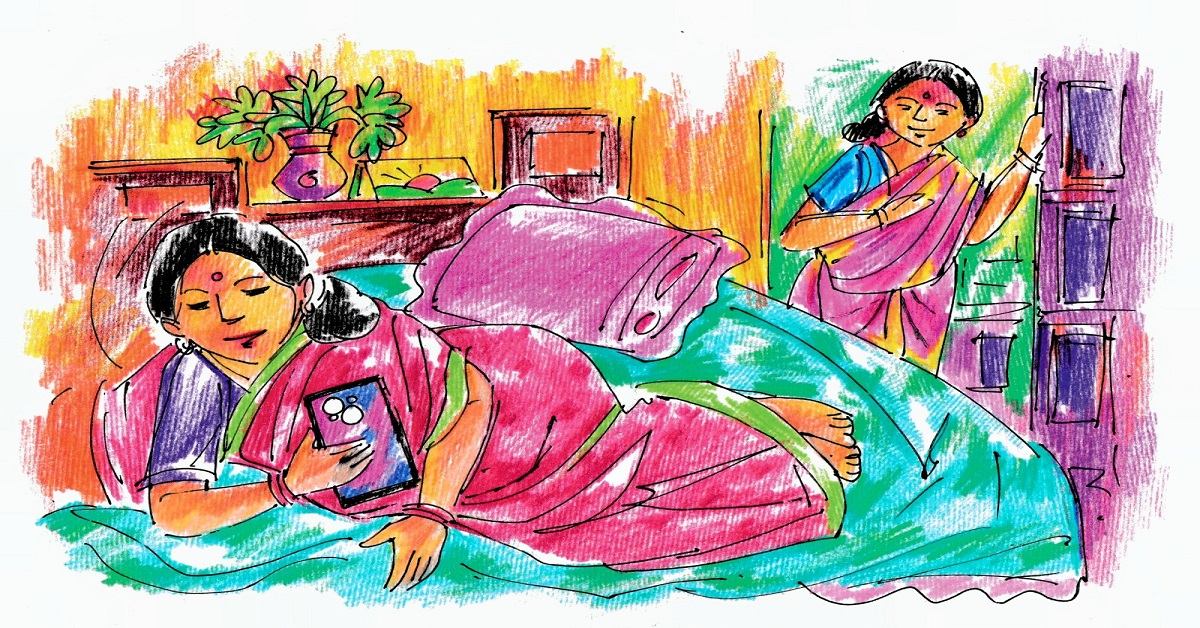 ‘‘না বউদি, লক্ষ্মী আমাদের সংসারটা সামলায়। একাহাতে সব কাজ করে। আর আমার সরস্বতী ইস্কুলে পড়ছে না? বছর বছর ভাল পাশ দিচ্ছে। ওদের কাজে দেব না। আর হ্যাঁ, মিনুও আর কাজ করবে না। ওই কথা বলতেই যাচ্ছি আজ। আমাদের পাশের ঘরের তপন, চেনো তো ওকে? এ-বাড়িতেও ইলেকট্রিকের কাজ করতে এসেছে কতবার। তপন নিজের দোকান দিয়েছে গতমাসে। ওর সঙ্গে মিনুর বিয়ে ঠিক করেছি। পুজো কাটলেই বিয়ে। তপনের মা-বাবার মিনুকে পছন্দ। তাই শাশুড়িমাকে আর মিনুকে আনতে যাচ্ছি। বুড়ো মানুষটা একা একা থাকে, দ্যাওর-জা তো ফিরেও দেখে না। মিনুটাও শ্বশুরবাড়ি চলে যাবে এবার। শাশুড়িমা আমার কাছেই থাকবে এখন থেকে। মিনুও চোখের সামনে থাকবে…বেশ ভাল হবে।’‘
